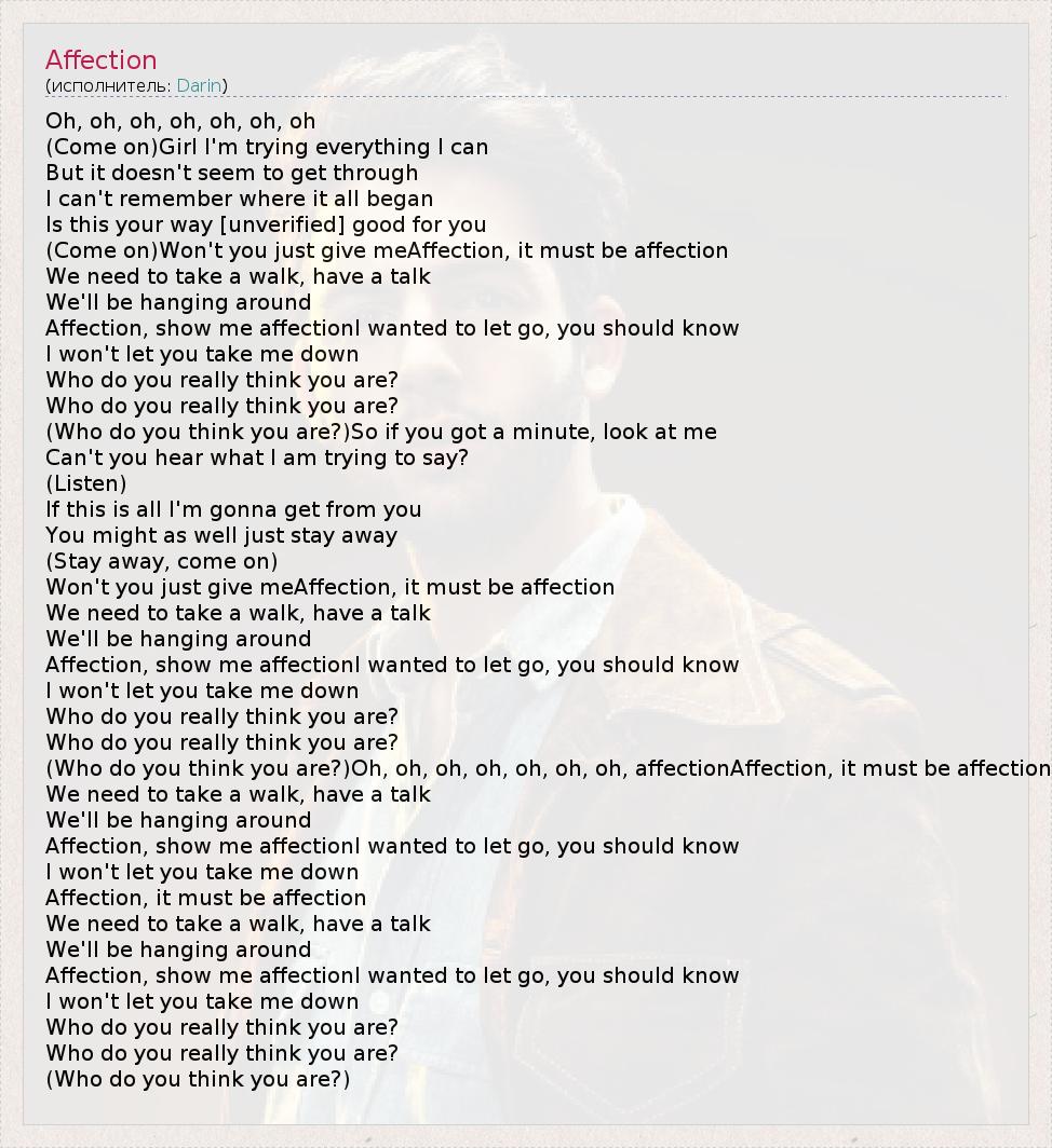 Oh, oh, oh, oh, oh, oh, oh (Come on)Girl I'm trying everything I can But it doesn't seem to get through I can't remember where it all began Is this your way [unverified] good for you (Come on)Won't you just give meAffection, it must be affection We need to take a walk, have a talk We'll be hanging around Affection, show me affectionI wanted to let go, you should know I won't let you take me down Who do you really think you are? Who do you really think you are? (Who do you think you are?)So if you got a minute, look at me Can't you hear what I am trying to say? (Listen) If this is all I'm gonna get from you You might as well just stay away (Stay away, come on) Won't you just give meAffection, it must be affection We need to take a walk, have a talk We'll be hanging around Affection, show me affectionI wanted to let go, you should know I won't let you take me down Who do you really think you are? Who do you really think you are? (Who do you think you are?)Oh, oh, oh, oh, oh, oh, oh, affectionAffection, it must be affection We need to take a walk, have a talk We'll be hanging around Affection, show me affectionI wanted to let go, you should know I won't let you take me down Affection, it must be affection We need to take a walk, have a talk We'll be hanging around Affection, show me affectionI wanted to let go, you should know I won't let you take me down Who do you really think you are? Who do you really think you are? (Who do you think you are?)