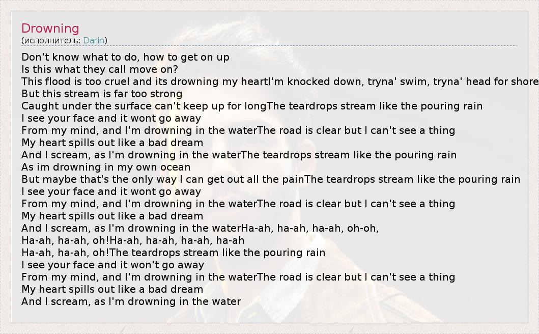 And I scream, as I'm drowning in the waterThe teardrops stream like the pouring rain