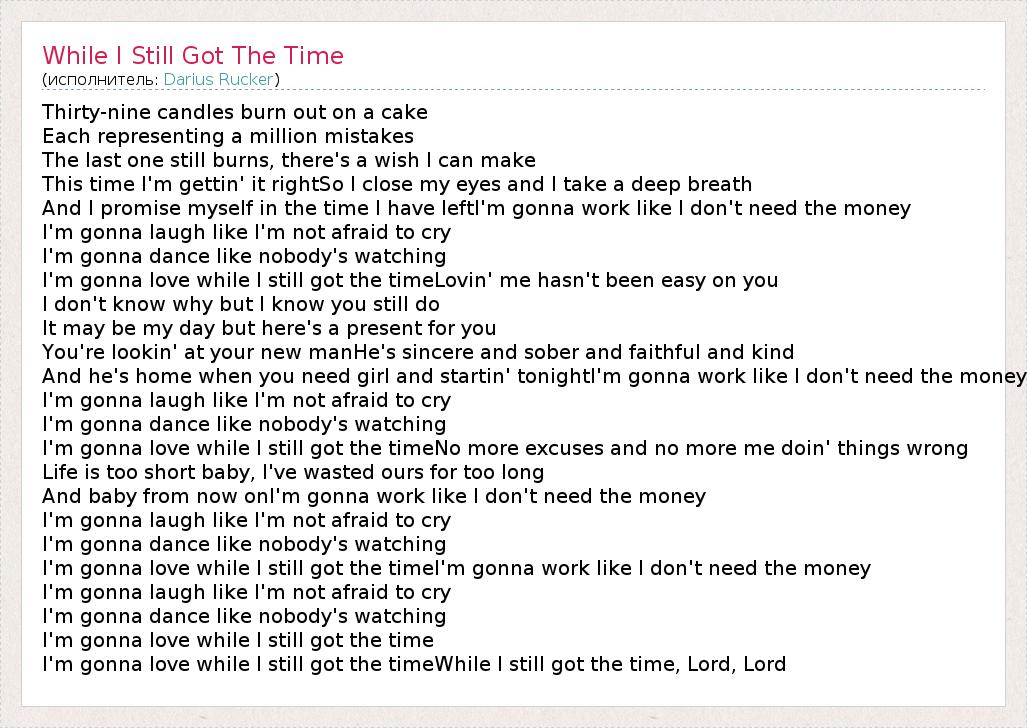 Thirty-nine candles burn out on a cake Each representing a million mistakes The last one still burns, there's a wish I can make This time I'm gettin' it rightSo I close my eyes and I take a deep breath And I promise myself in the time I have leftI'm gonna work like I don't need the money I'm gonna laugh like I'm not afraid to cry I'm gonna dance like nobody's watching I'm gonna love while I still got the timeLovin' me hasn't been easy on you I don't know why but I know you still do It may be my day but here's a present for you You're lookin' at your new manHe's sincere and sober and faithful and kind And he's home when you need girl and startin' tonightI'm gonna work like I don't need the money I'm gonna laugh like I'm not afraid to cry I'm gonna dance like nobody's watching I'm gonna love while I still got the timeNo more excuses and no more me doin' things wrong Life is too short baby, I've wasted ours for too long And baby from now onI'm gonna work like I don't need the money I'm gonna laugh like I'm not afraid to cry I'm gonna dance like nobody's watching I'm gonna love while I still got the timeI'm gonna work like I don't need the money I'm gonna laugh like I'm not afraid to cry I'm gonna dance like nobody's watching I'm gonna love while I still got the time I'm gonna love while I still got the timeWhile I still got the time, Lord, Lord