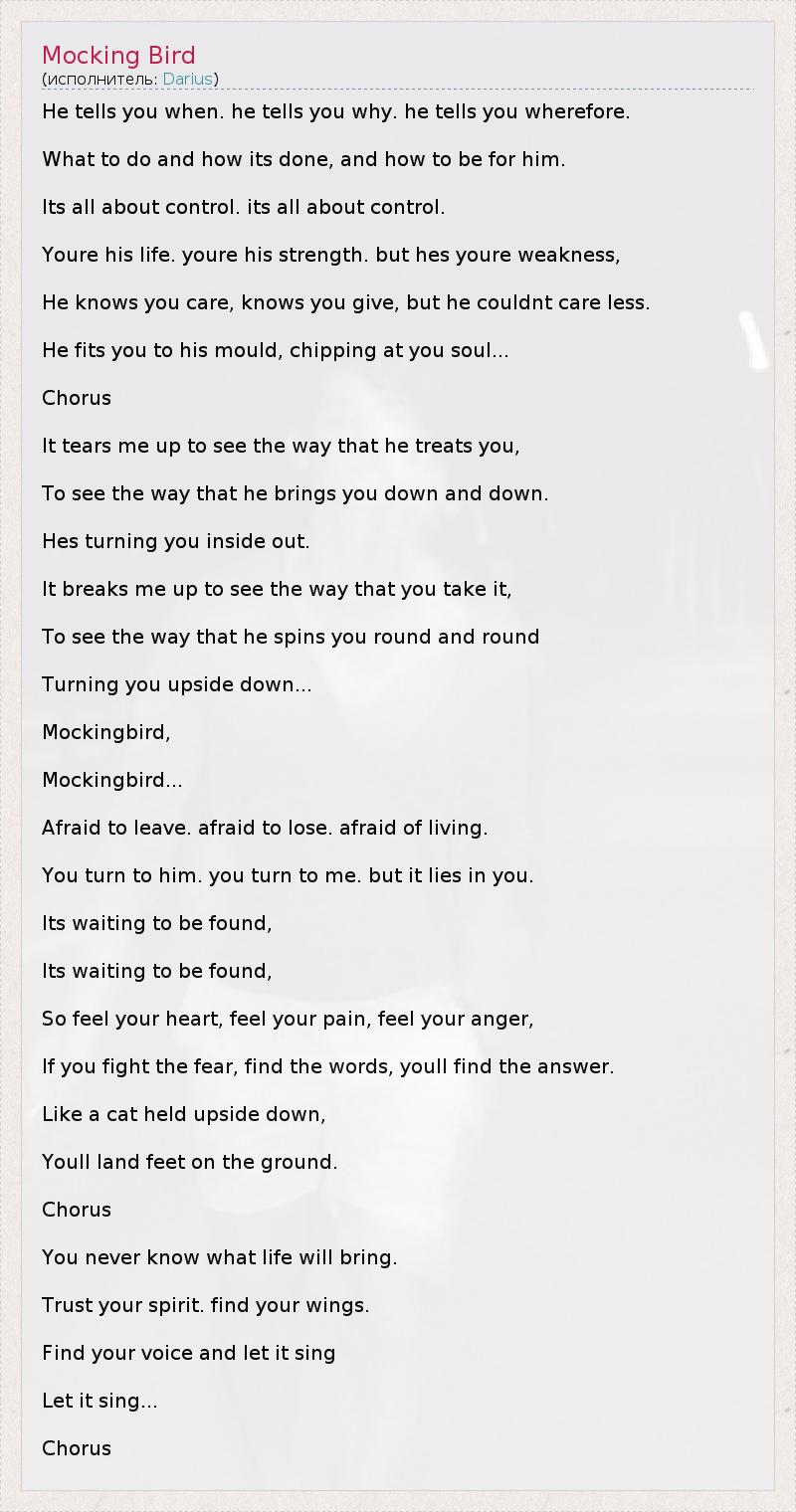 He tells you when. he tells you why. he tells you wherefore. What to do and how its done, and how to be for him. Its all about control. its all about control. Youre his life. youre his strength. but hes youre weakness, He knows you care, knows you give, but he couldnt care less. He fits you to his mould, chipping at you soul... Chorus It tears me up to see the way that he treats you, To see the way that he brings you down and down. Hes turning you inside out. It breaks me up to see the way that you take it, To see the way that he spins you round and round Turning you upside down... Mockingbird, Mockingbird... Afraid to leave. afraid to lose. afraid of living. You turn to him. you turn to me. but it lies in you. Its waiting to be found, Its waiting to be found, So feel your heart, feel your pain, feel your anger, If you fight the fear, find the words, youll find the answer. Like a cat held upside down, Youll land feet on the ground. Chorus You never know what life will bring. Trust your spirit. find your wings. Find your voice and let it sing Let it sing... Chorus