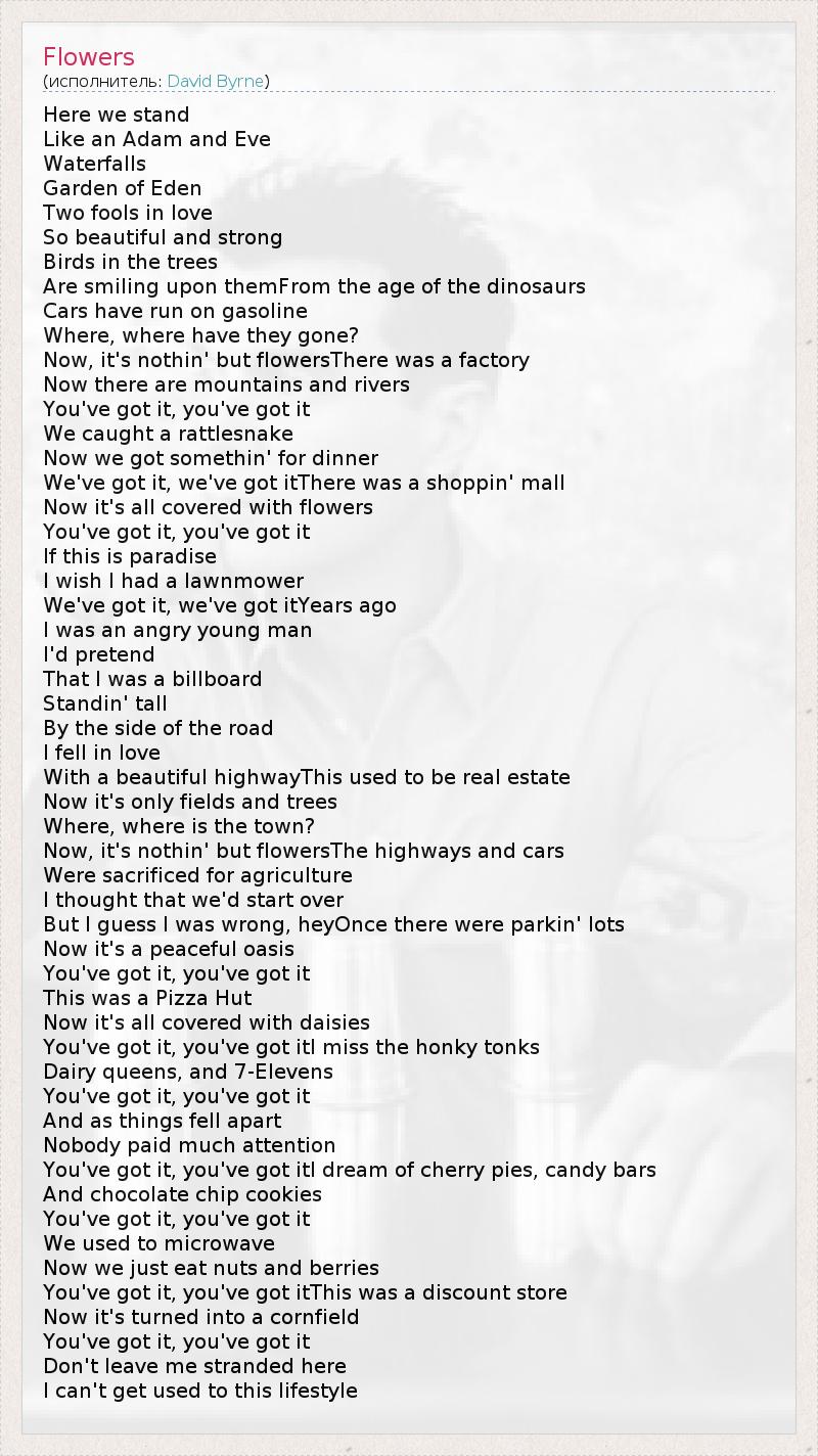 Это интересно:Дэвид Бирн (David Byrne) родился в Дамбартоне, Шотландия, 14 мая 1952 года. Когда ему было 2 года, вместе со своими родителями он переехал в Канаду, где его отцу и матери предложили выгодную работу. Когда Дэвиду было 9 лет, он вместе со своей семьей вновь меняет место жительства. На сей раз они перебираются к предместьям Балтимора Штата Мэриленд. В сентябре 1970 года закончив высшую школу, Дэвид... продолжение