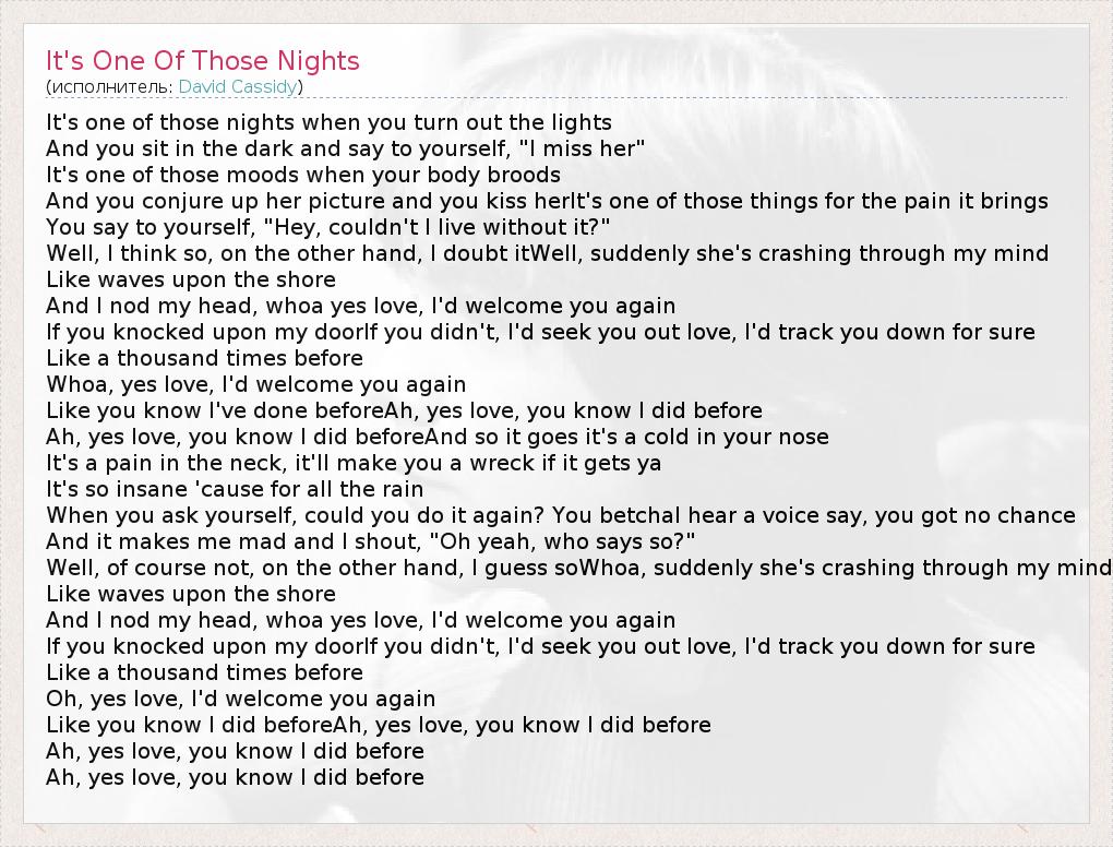 А как ты думаешь, о чем песня "It's One Of Those Nights" ?