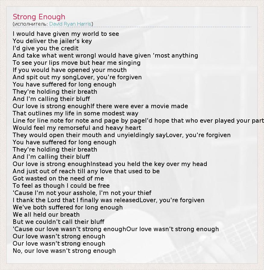 I would have given my world to see You deliver the jailer's key I'd give you the credit And take what went wrongI would have given 'most anything To see your lips move but hear me singing If you would have opened your mouth And spit out my songLover, you're forgiven You have suffered for long enough They're holding their breath And I'm calling their bluff Our love is strong enoughIf there were ever a movie made That outlines my life in some modest way Line for line note for note and page by pageI'd hope that who ever played your part Would feel my remorseful and heavy heart They would open their mouth and unyieldingly sayLover, you're forgiven You have suffered for long enough They're holding their breath And I'm calling their bluff Our love is strong enoughInstead you held the key over my head And just out of reach till any love that used to be Got wasted on the need of me To feel as though I could be free 'Cause I'm not your asshole, I'm not your thief I thank the Lord that I finally was releasedLover, you're forgiven We've both suffered for long enough We all held our breath But we couldn't call their bluff 'Cause our love wasn't strong enoughOur love wasn't strong enough Our love wasn't strong enough Our love wasn't strong enough No, our love wasn't strong enough