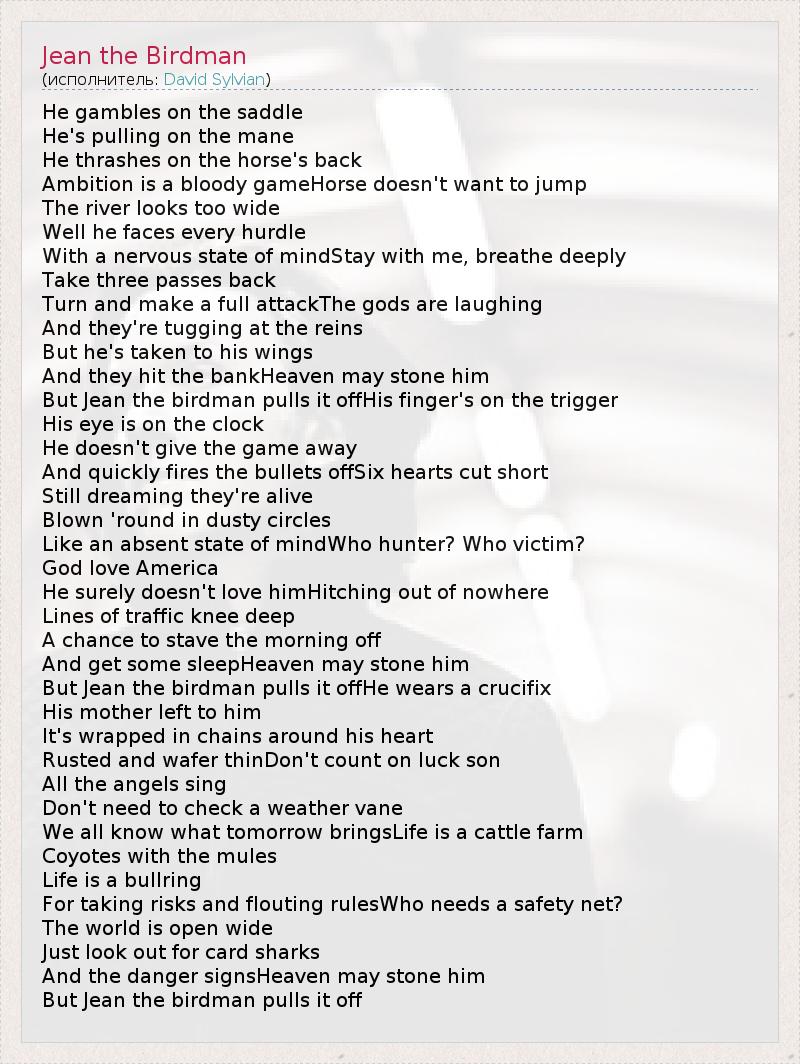 А как ты думаешь, о чем песня "Jean the Birdman" ?