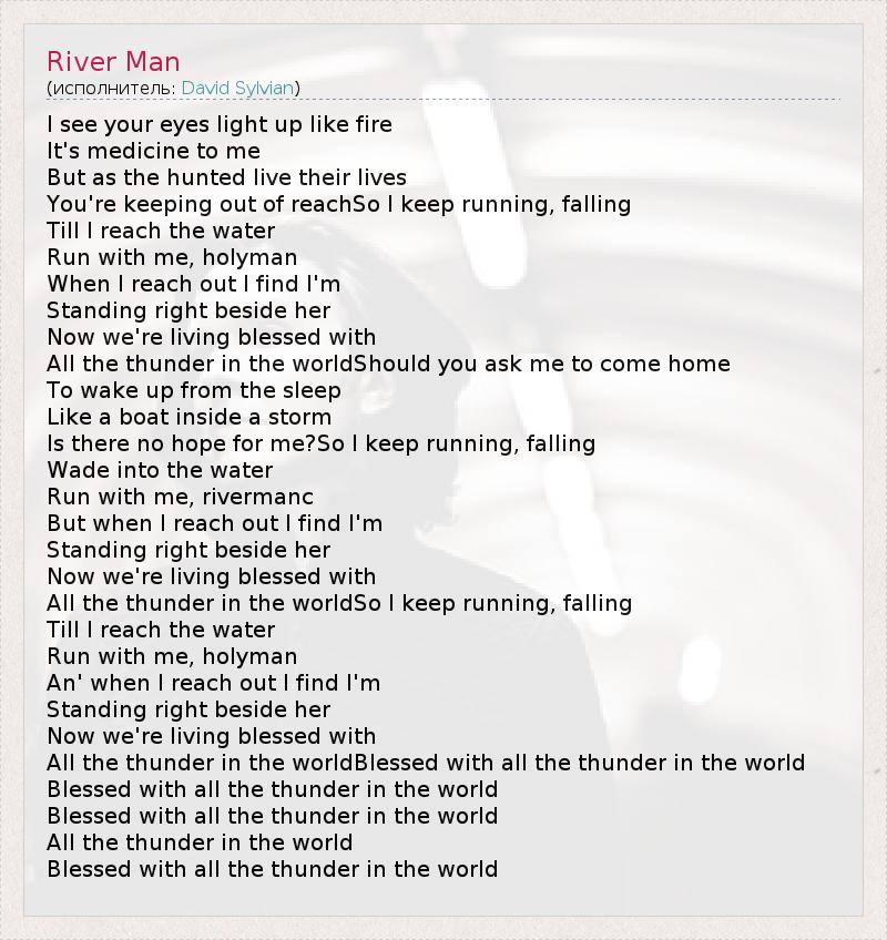 I see your eyes light up like fire It's medicine to me But as the hunted live their lives You're keeping out of reachSo I keep running, falling Till I reach the water Run with me, holyman When I reach out I find I'm Standing right beside her Now we're living blessed with All the thunder in the worldShould you ask me to come home To wake up from the sleep Like a boat inside a storm Is there no hope for me?So I keep running, falling Wade into the water Run with me, rivermanc But when I reach out I find I'm Standing right beside her Now we're living blessed with All the thunder in the worldSo I keep running, falling Till I reach the water Run with me, holyman An' when I reach out I find I'm Standing right beside her Now we're living blessed with All the thunder in the worldBlessed with all the thunder in the world Blessed with all the thunder in the world Blessed with all the thunder in the world All the thunder in the world Blessed with all the thunder in the world
