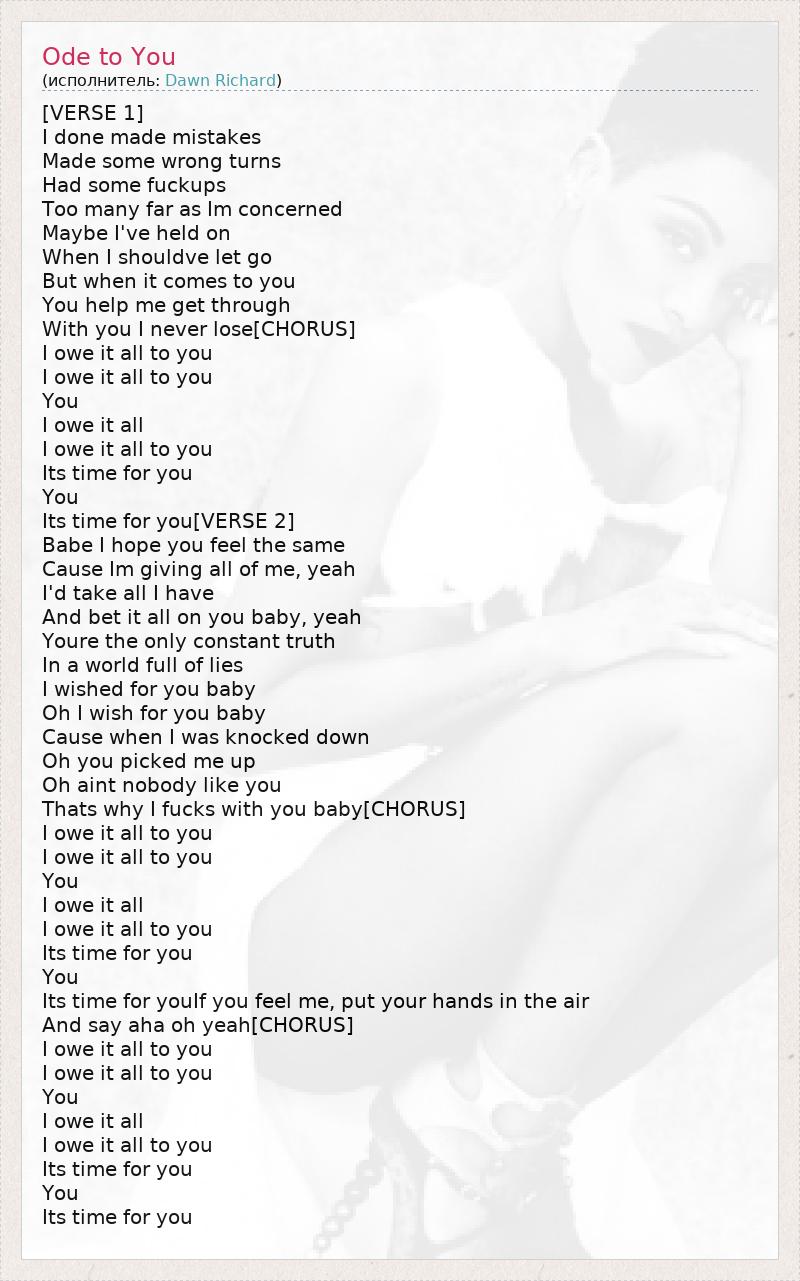 [VERSE 1] I done made mistakes Made some wrong turns Had some fuckups Too many far as Im concerned Maybe I've held on When I shouldve let go But when it comes to you You help me get through With you I never lose[CHORUS] I owe it all to you I owe it all to you You I owe it all I owe it all to you Its time for you You Its time for you[VERSE 2] Babe I hope you feel the same Cause Im giving all of me, yeah I'd take all I have And bet it all on you baby, yeah Youre the only constant truth In a world full of lies I wished for you baby Oh I wish for you baby Cause when I was knocked down Oh you picked me up Oh aint nobody like you Thats why I fucks with you baby[CHORUS] I owe it all to you I owe it all to you You I owe it all I owe it all to you Its time for you You Its time for youIf you feel me, put your hands in the air And say aha oh yeah[CHORUS] I owe it all to you I owe it all to you You I owe it all I owe it all to you Its time for you You Its time for you