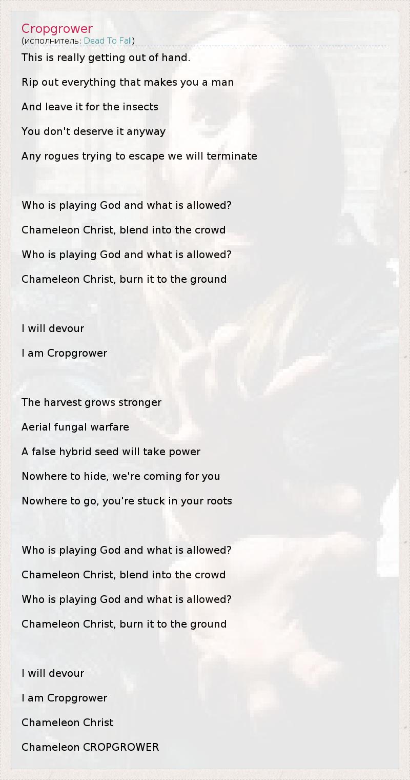 This is really getting out of hand. Rip out everything that makes you a man And leave it for the insects You don't deserve it anyway Any rogues trying to escape we will terminate Who is playing God and what is allowed? Chameleon Christ, blend into the crowd Who is playing God and what is allowed? Chameleon Christ, burn it to the ground I will devour I am Cropgrower The harvest grows stronger Aerial fungal warfare A false hybrid seed will take power Nowhere to hide, we're coming for you Nowhere to go, you're stuck in your roots Who is playing God and what is allowed? Chameleon Christ, blend into the crowd Who is playing God and what is allowed? Chameleon Christ, burn it to the ground I will devour I am Cropgrower Chameleon Christ Chameleon CROPGROWER