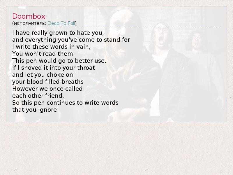 I have really grown to hate you, and everything you've come to stand for I write these words in vain, You won't read them This pen would go to better use. if I shoved it into your throat and let you choke on your blood-filled breaths However we once called each other friend, So this pen continues to write words that you ignore