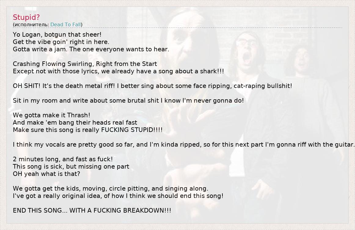 Yo Logan, botgun that sheer! Get the vibe goin' right in here. Gotta write a jam. The one everyone wants to hear. Crashing Flowing Swirling, Right from the Start Except not with those lyrics, we already have a song about a shark!!! OH SHIT! It's the death metal riff! I better sing about some face ripping, cat-raping bullshit! Sit in my room and write about some brutal shit I know I'm never gonna do! We gotta make it Thrash! And make 'em bang their heads real fast Make sure this song is really FUCKING STUPID!!!! I think my vocals are pretty good so far, and I'm kinda ripped, so for this next part I'm gonna riff with the guitar. 2 minutes long, and fast as fuck! This song is sick, but missing one part OH yeah what is that? We gotta get the kids, moving, circle pitting, and singing along. I've got a really original idea, of how I think we should end this song! END THIS SONG... WITH A FUCKING BREAKDOWN!!!