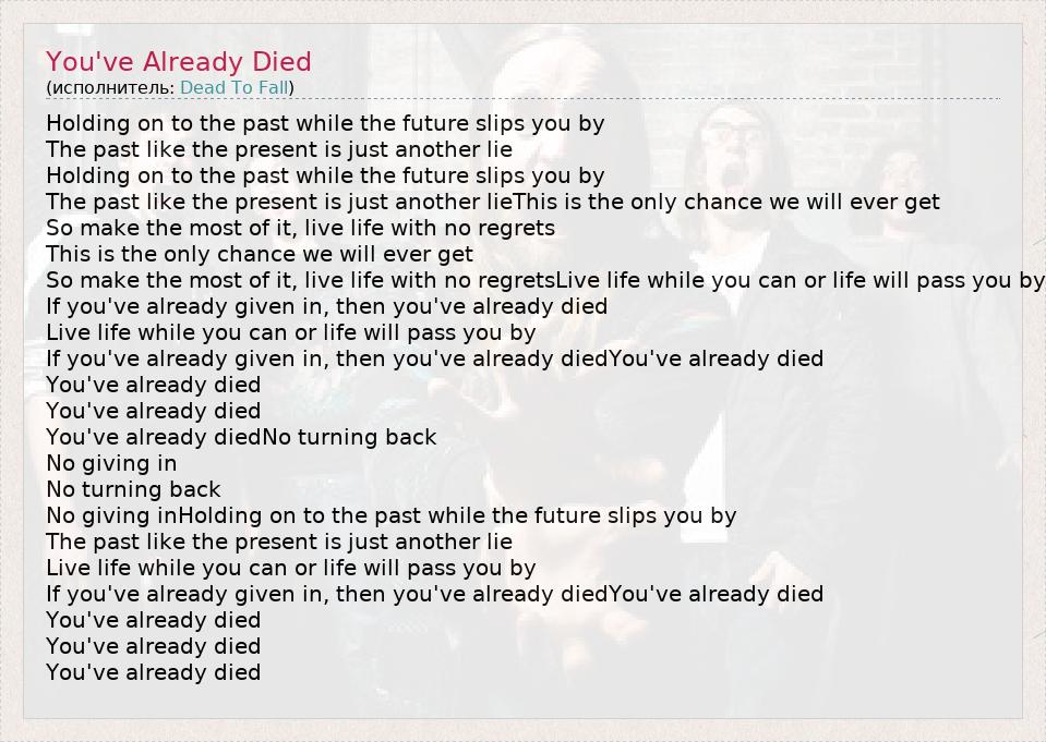 Holding on to the past while the future slips you by The past like the present is just another lie Holding on to the past while the future slips you by The past like the present is just another lieThis is the only chance we will ever get So make the most of it, live life with no regrets This is the only chance we will ever get So make the most of it, live life with no regretsLive life while you can or life will pass you by If you've already given in, then you've already died Live life while you can or life will pass you by If you've already given in, then you've already diedYou've already died You've already died You've already died You've already diedNo turning back No giving in No turning back No giving inHolding on to the past while the future slips you by The past like the present is just another lie Live life while you can or life will pass you by If you've already given in, then you've already diedYou've already died You've already died You've already died You've already died