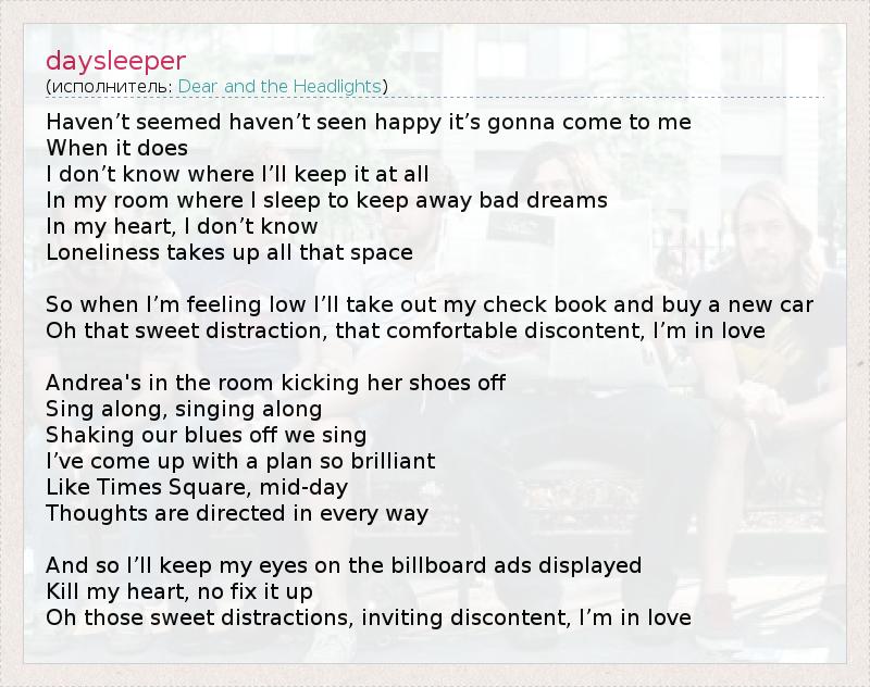 Haven’t seemed haven’t seen happy it’s gonna come to me When it does I don’t know where I’ll keep it at all In my room where I sleep to keep away bad dreams In my heart, I don’t know Loneliness takes up all that space So when I’m feeling low I’ll take out my check book and buy a new car Oh that sweet distraction, that comfortable discontent, I’m in love Andrea's in the room kicking her shoes off Sing along, singing along Shaking our blues off we sing I’ve come up with a plan so brilliant Like Times Square, mid-day Thoughts are directed in every way And so I’ll keep my eyes on the billboard ads displayed Kill my heart, no fix it up Oh those sweet distractions, inviting discontent, I’m in love