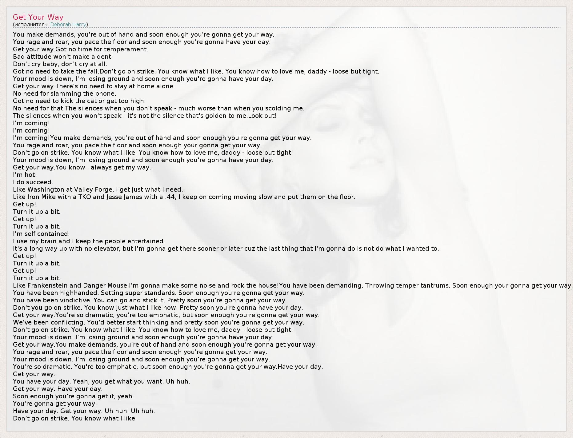 You make demands, you're out of hand and soon enough you're gonna get your way. You rage and roar, you pace the floor and soon enough you're gonna have your day. Get your way.Got no time for temperament. Bad attitude won't make a dent. Don't cry baby, don't cry at all. Got no need to take the fall.Don't go on strike. You know what I like. You know how to love me, daddy - loose but tight. Your mood is down, I'm losing ground and soon enough you're gonna have your day. Get your way.There's no need to stay at home alone. No need for slamming the phone. Got no need to kick the cat or get too high. No need for that.The silences when you don't speak - much worse than when you scolding me. The silences when you won't speak - it's not the silence that's golden to me.Look out! I'm coming! I'm coming! I'm coming!You make demands, you're out of hand and soon enough you're gonna get your way. You rage and roar, you pace the floor and soon enough your gonna get your way. Don't go on strike. You know what I like. You know how to love me, daddy - loose but tight. Your mood is down, I'm losing ground and soon enough you're gonna have your day. Get your way.You know I always get my way. I'm hot! I do succeed. Like Washington at Valley Forge, I get just what I need. Like Iron Mike with a TKO and Jesse James with a .44, I keep on coming moving slow and put them on the floor. Get up! Turn it up a bit. Get up! Turn it up a bit. I'm self contained. I use my brain and I keep the people entertained. It's a long way up with no elevator, but I'm gonna get there sooner or later cuz the last thing that I'm gonna do is not do what I wanted to. Get up! Turn it up a bit. Get up! Turn it up a bit. Like Frankenstein and Danger Mouse I'm gonna make some noise and rock the house!You have been demanding. Throwing temper tantrums. Soon enough your gonna get your way. You have been highhanded. Setting super standards. Soon enough you're gonna get your way. You have been vindictive. You can go and stick it. Pretty soon you're gonna get your way. Don't you go on strike. You know just what I like now. Pretty soon you're gonna have your day. Get your way.You're so dramatic, you're too emphatic, but soon enough you're gonna get your way. We've been conflicting. You'd better start thinking and pretty soon you're gonna get your way. Don't go on strike. You know what I like. You know how to love me, daddy - loose but tight. Your mood is down. I'm losing ground and soon enough you're gonna have your day. Get your way.You make demands, you're out of hand and soon enough you're gonna get your way. You rage and roar, you pace the floor and soon enough you're gonna get your way. Your mood is down. I'm losing ground and soon enough you're gonna get your way. You're so dramatic. You're too emphatic, but soon enough you're gonna get your way.Have your day. Get your way. You have your day. Yeah, you get what you want. Uh huh. Get your way. Have your day. Soon enough you're gonna get it, yeah. You're gonna get your way. Have your day. Get your way. Uh huh. Uh huh. Don't go on strike. You know what I like.