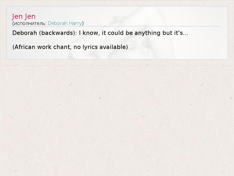 Deborah (backwards): I know, it could be anything but it's... (African work chant, no lyrics available)