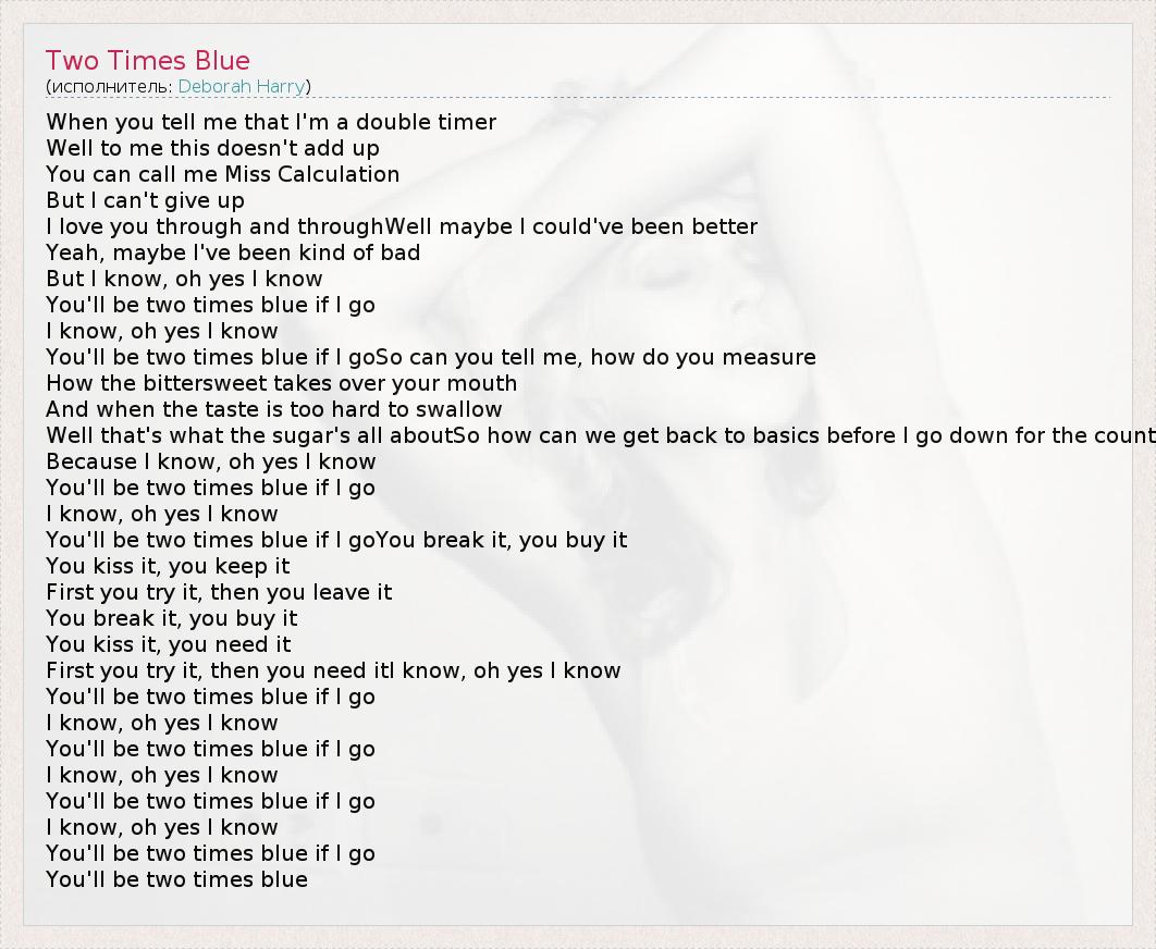 When you tell me that I'm a double timer Well to me this doesn't add up You can call me Miss Calculation But I can't give up I love you through and throughWell maybe I could've been better Yeah, maybe I've been kind of bad But I know, oh yes I know You'll be two times blue if I go I know, oh yes I know You'll be two times blue if I goSo can you tell me, how do you measure How the bittersweet takes over your mouth And when the taste is too hard to swallow Well that's what the sugar's all aboutSo how can we get back to basics before I go down for the count Because I know, oh yes I know You'll be two times blue if I go I know, oh yes I know You'll be two times blue if I goYou break it, you buy it You kiss it, you keep it First you try it, then you leave it You break it, you buy it You kiss it, you need it First you try it, then you need itI know, oh yes I know You'll be two times blue if I go I know, oh yes I know You'll be two times blue if I go I know, oh yes I know You'll be two times blue if I go I know, oh yes I know You'll be two times blue if I go You'll be two times blue