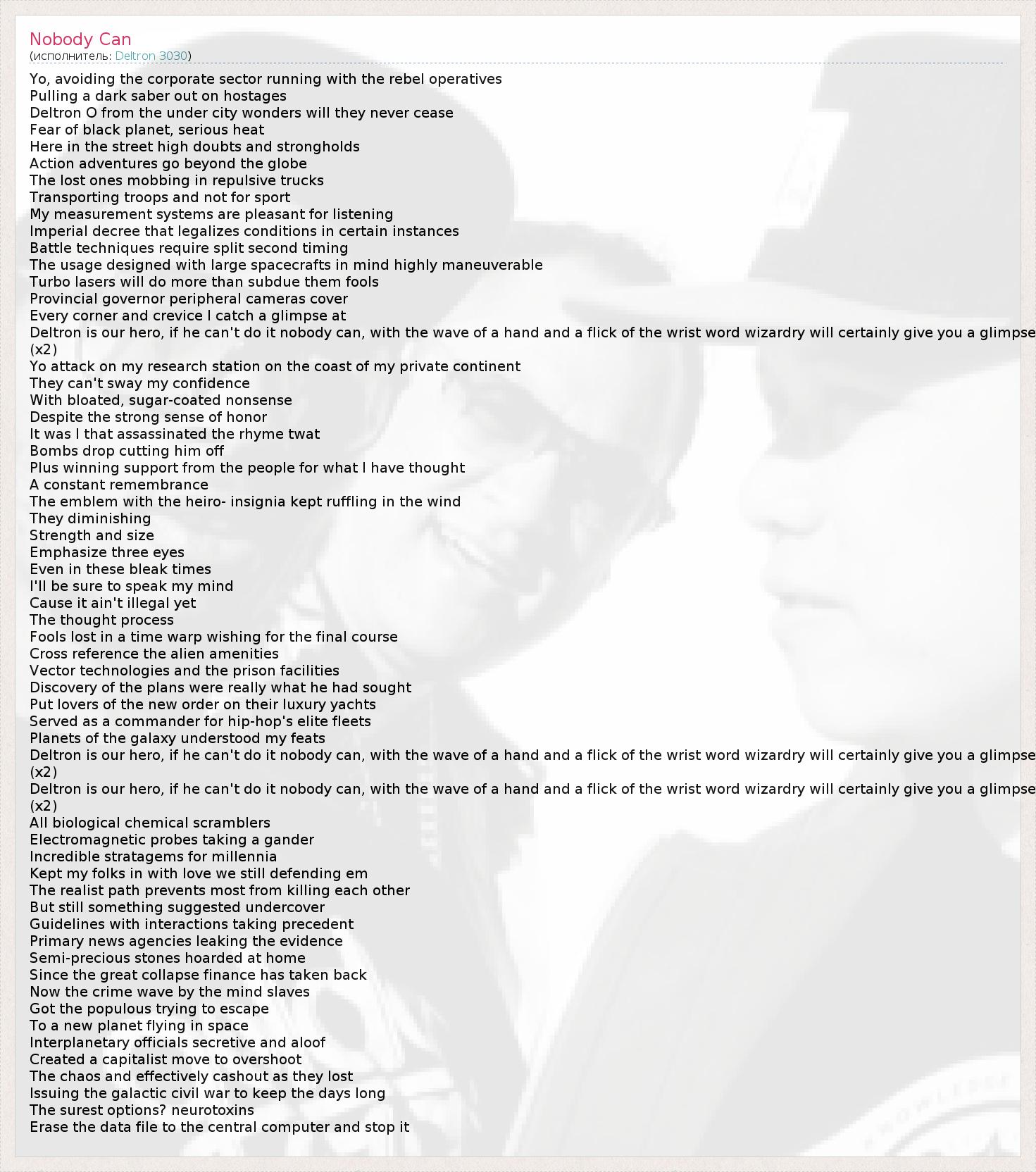 Yo, avoiding the corporate sector running with the rebel operatives Pulling a dark saber out on hostages Deltron O from the under city wonders will they never cease Fear of black planet, serious heat Here in the street high doubts and strongholds Action adventures go beyond the globe The lost ones mobbing in repulsive trucks Transporting troops and not for sport My measurement systems are pleasant for listening Imperial decree that legalizes conditions in certain instances Battle techniques require split second timing The usage designed with large spacecrafts in mind highly maneuverable Turbo lasers will do more than subdue them fools Provincial governor peripheral cameras cover Every corner and crevice I catch a glimpse at Deltron is our hero, if he can't do it nobody can, with the wave of a hand and a flick of the wrist word wizardry will certainly give you a glimpse (x2) Yo attack on my research station on the coast of my private continent They can't sway my confidence With bloated, sugar-coated nonsense Despite the strong sense of honor It was I that assassinated the rhyme twat Bombs drop cutting him off Plus winning support from the people for what I have thought A constant remembrance The emblem with the heiro- insignia kept ruffling in the wind They diminishing Strength and size Emphasize three eyes Even in these bleak times I'll be sure to speak my mind Cause it ain't illegal yet The thought process Fools lost in a time warp wishing for the final course Cross reference the alien amenities Vector technologies and the prison facilities Discovery of the plans were really what he had sought Put lovers of the new order on their luxury yachts Served as a commander for hip-hop's elite fleets Planets of the galaxy understood my feats Deltron is our hero, if he can't do it nobody can, with the wave of a hand and a flick of the wrist word wizardry will certainly give you a glimpse (x2) Deltron is our hero, if he can't do it nobody can, with the wave of a hand and a flick of the wrist word wizardry will certainly give you a glimpse (x2) All biological chemical scramblers Electromagnetic probes taking a gander Incredible stratagems for millennia Kept my folks in with love we still defending em The realist path prevents most from killing each other But still something suggested undercover Guidelines with interactions taking precedent Primary news agencies leaking the evidence Semi-precious stones hoarded at home Since the great collapse finance has taken back Now the crime wave by the mind slaves Got the populous trying to escape To a new planet flying in space Interplanetary officials secretive and aloof Created a capitalist move to overshoot The chaos and effectively cashout as they lost Issuing the galactic civil war to keep the days long The surest options? neurotoxins Erase the data file to the central computer and stop it