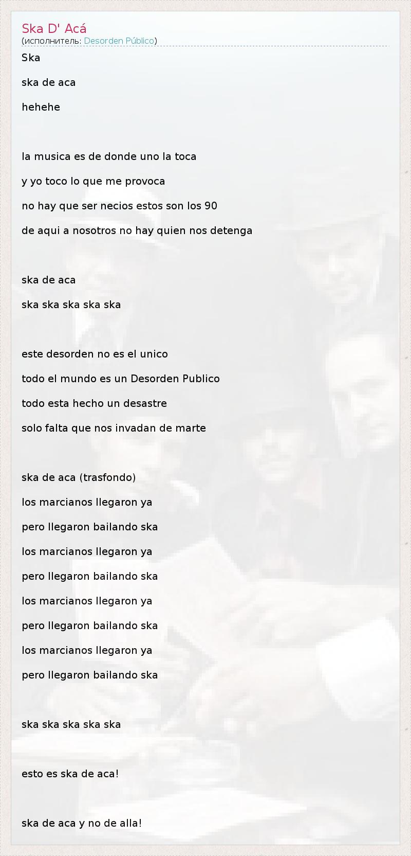 Это интересно:Desorden Público - ска/рок-группа, основанная в 1985 в Каракасе, Венесуэле.Музыка группы - это смесь ска, латиноамериканского рок, регги и народных латиноамериканских мелодий. Социальная лирика группы известна тем, что она комментирует политические события в Венесуэле и в Латинской Америке. Desorden Público использует в своем творчестве различные языки и способствует расовой и социальной терпимости.... продолжение