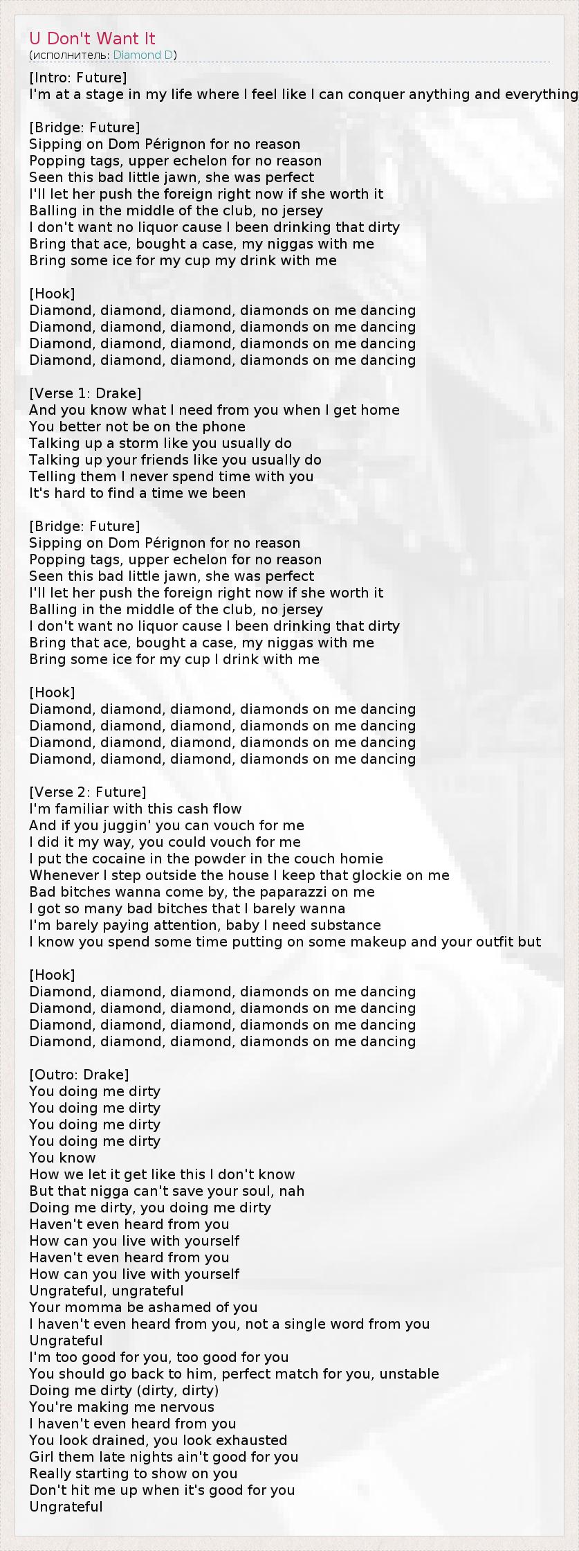 [Вступление: Future] Сейчас у меня такой этап в жизни, когда чувствую, что могу покорить всё и вся. [Переход: Future] Просто так попиваю Дом Периньон, 1 Высшему слою не нужна причина, чтобы менять шмотки каждый день. 2 Увидел аппетитную цацу, она прекрасна. Я дам ей завести иномарку прямо сейчас, если она это заслужит. Посреди клуба я без майки, отдыхаю и транжирю бабки. 3 Я не хочу алкоголь, ведь я уже под другим дурманом. 4 Принесите мне тузов, целый ящик, 5 ведь со мной мои кенты. Принесите мне немного льда для выпивки в моем стакане. [Припев:] Бриллианты, бриллианты, бриллианты, вокруг меня танцуют бриллианты. Бриллианты, бриллианты, бриллианты, вокруг меня танцуют бриллианты. Бриллианты, бриллианты, бриллианты, вокруг меня танцуют бриллианты. Бриллианты, бриллианты, бриллианты, вокруг меня танцуют бриллианты. 6 [Куплет 1: Drake] Ты же знаешь, что мне нужно от тебя, когда доберусь до дома. Тебе лучше не говорить по телефону, Не делать из мухи слона, 7 как обычно делаешь, Не болтать с друзьями, как обычно болтаешь, Рассказывая им, что никогда не провожу с тобой время. Тяжело выкроить время для нас. [Переход: Future] Просто так попиваю Дом Периньон, Высшему слою не нужна причина, чтобы менять шмотки каждый день. Увидел аппетитную цацу, она прекрасна. Я дам ей завести иномарку прямо сейчас, если она это заслужит. Посреди клуба я без майки, отдыхаю и транжирю бабки. Я не хочу алкоголь, ведь я уже под другим дурманом. Принесите мне тузов, целый ящик, ведь со мной мои кенты. Принесите мне немного льда для выпивки в моем стакане. [Припев:] Бриллианты, бриллианты, бриллианты, вокруг меня танцуют бриллианты. Бриллианты, бриллианты, бриллианты, вокруг меня танцуют бриллианты. Бриллианты, бриллианты, бриллианты, вокруг меня танцуют бриллианты. Бриллианты, бриллианты, бриллианты, вокруг меня танцуют бриллианты. [Куплет 2: Future] Я знаком с денежными потоками. А если у тебя левый доход, то ты можешь поручиться за меня. Я выбрал свой путь, ты мог бы поручиться за меня. Я прятал кокс в порошок, в диван, чувак. Всякий раз, выходя на улицу из дома, я беру с собой глок. 8 Стервы хотят поиметь с меня, журналюги палят на меня. У меня столько с*чек, что я едва хочу их. Я едва обращаю на них внимание, детка, мне нужные вещества. Я знаю, ты потратила кучу времени на макияж и на прикид, но... [Припев:] Бриллианты, бриллианты, бриллианты, вокруг меня танцуют бриллианты. Бриллианты, бриллианты, бриллианты, вокруг меня танцуют бриллианты. Бриллианты, бриллианты, бриллианты, вокруг меня танцуют бриллианты. Бриллианты, бриллианты, бриллианты, вокруг меня танцуют бриллианты. [Концовка: Drake] Ты поступаешь подло со мной. Ты поступаешь подло со мной. Ты поступаешь подло со мной. Ты поступаешь подло со мной. Ты знаешь. Как мы допустили такое между нами, я не знаю, Но этот н*гер не сможет уберечь твою душу, не-а. Подло, ты поступаешь подло со мной. От тебя ни слуху, ни духу. Как ты можешь смириться с таким. От тебя ни слуху, ни духу. Как ты можешь смириться с таким. Неблагодарная, неблагодарная. Твоя мамаша будет стыдиться тебя. От тебя ни слуху, ни духу, ни словечка от тебя. Неблагодарная. Я слишком хорош для тебя, слишком хорош для тебя. Тебе следует вернуться к нему, он идеально подходит тебе, такой же долбанутый. Поступаешь подло со мной (подло, подло). Ты меня раздражаешь. От тебя ни слуху, ни духу. Ты выглядишь опустошённой, ты выгляди