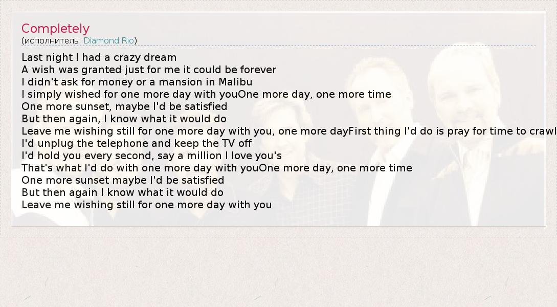 Last night I had a crazy dream A wish was granted just for me it could be forever I didn't ask for money or a mansion in Malibu I simply wished for one more day with youOne more day, one more time One more sunset, maybe I'd be satisfied But then again, I know what it would do Leave me wishing still for one more day with you, one more dayFirst thing I'd do is pray for time to crawl I'd unplug the telephone and keep the TV off I'd hold you every second, say a million I love you's That's what I'd do with one more day with youOne more day, one more time One more sunset maybe I'd be satisfied But then again I know what it would do Leave me wishing still for one more day with you