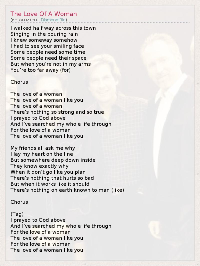 I walked half way across this town Singing in the pouring rain I knew someway somehow I had to see your smiling face Some people need some time Some people need their space But when you're not in my arms You're too far away (for) Chorus The love of a woman The love of a woman like you The love of a woman There's nothing so strong and so true I prayed to God above And I've searched my whole life through For the love of a woman The love of a woman like you My friends all ask me why I lay my heart on the line But somewhere deep down inside They know exactly why When it don't go like you plan There's nothing that hurts so bad But when it works like it should There's nothing on earth known to man (like) Chorus (Tag) I prayed to God above And I've searched my whole life through For the love of a woman The love of a woman like you For the love of a woman The love of a woman like you