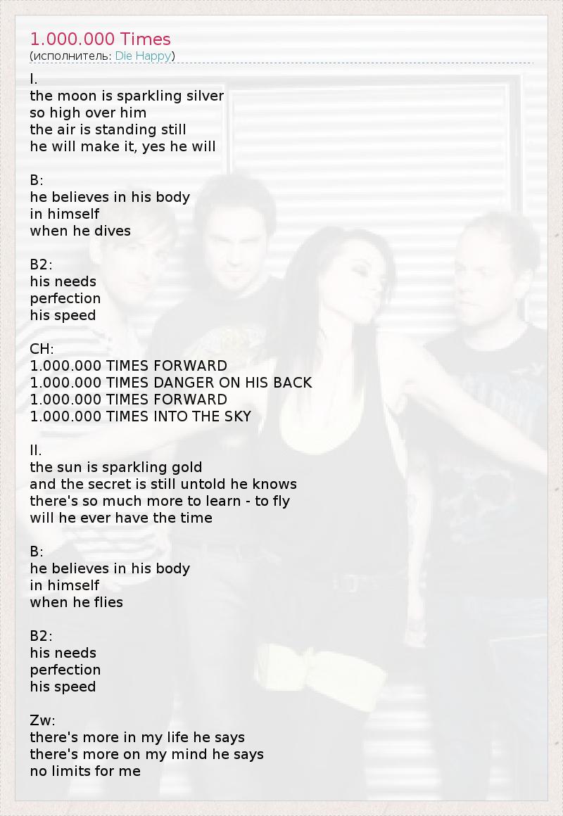I. the moon is sparkling silver so high over him the air is standing still he will make it, yes he will B: he believes in his body in himself when he dives B2: his needs perfection his speed CH: 1.000.000 TIMES FORWARD 1.000.000 TIMES DANGER ON HIS BACK 1.000.000 TIMES FORWARD 1.000.000 TIMES INTO THE SKY II. the sun is sparkling gold and the secret is still untold he knows there's so much more to learn - to fly will he ever have the time B: he believes in his body in himself when he flies B2: his needs perfection his speed Zw: there's more in my life he says there's more on my mind he says no limits for me