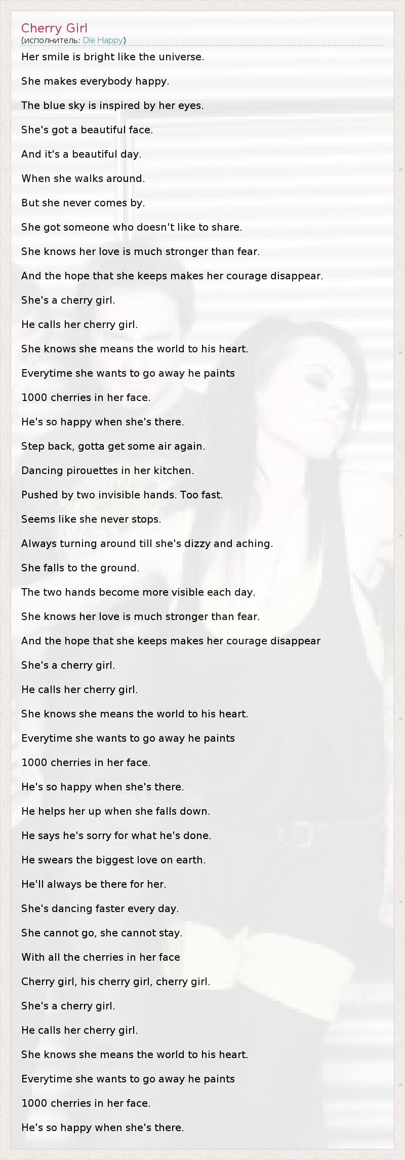 Her smile is bright like the universe. She makes everybody happy. The blue sky is inspired by her eyes. She's got a beautiful face. And it's a beautiful day. When she walks around. But she never comes by. She got someone who doesn't like to share. She knows her love is much stronger than fear. And the hope that she keeps makes her courage disappear. She's a cherry girl. He calls her cherry girl. She knows she means the world to his heart. Everytime she wants to go away he paints 1000 cherries in her face. He's so happy when she's there. Step back, gotta get some air again. Dancing pirouettes in her kitchen. Pushed by two invisible hands. Too fast. Seems like she never stops. Always turning around till she's dizzy and aching. She falls to the ground. The two hands become more visible each day. She knows her love is much stronger than fear. And the hope that she keeps makes her courage disappear She's a cherry girl. He calls her cherry girl. She knows she means the world to his heart. Everytime she wants to go away he paints 1000 cherries in her face. He's so happy when she's there. He helps her up when she falls down. He says he's sorry for what he's done. He swears the biggest love on earth. He'll always be there for her. She's dancing faster every day. She cannot go, she cannot stay. With all the cherries in her face Cherry girl, his cherry girl, cherry girl. She's a cherry girl. He calls her cherry girl. She knows she means the world to his heart. Everytime she wants to go away he paints 1000 cherries in her face. He's so happy when she's there.