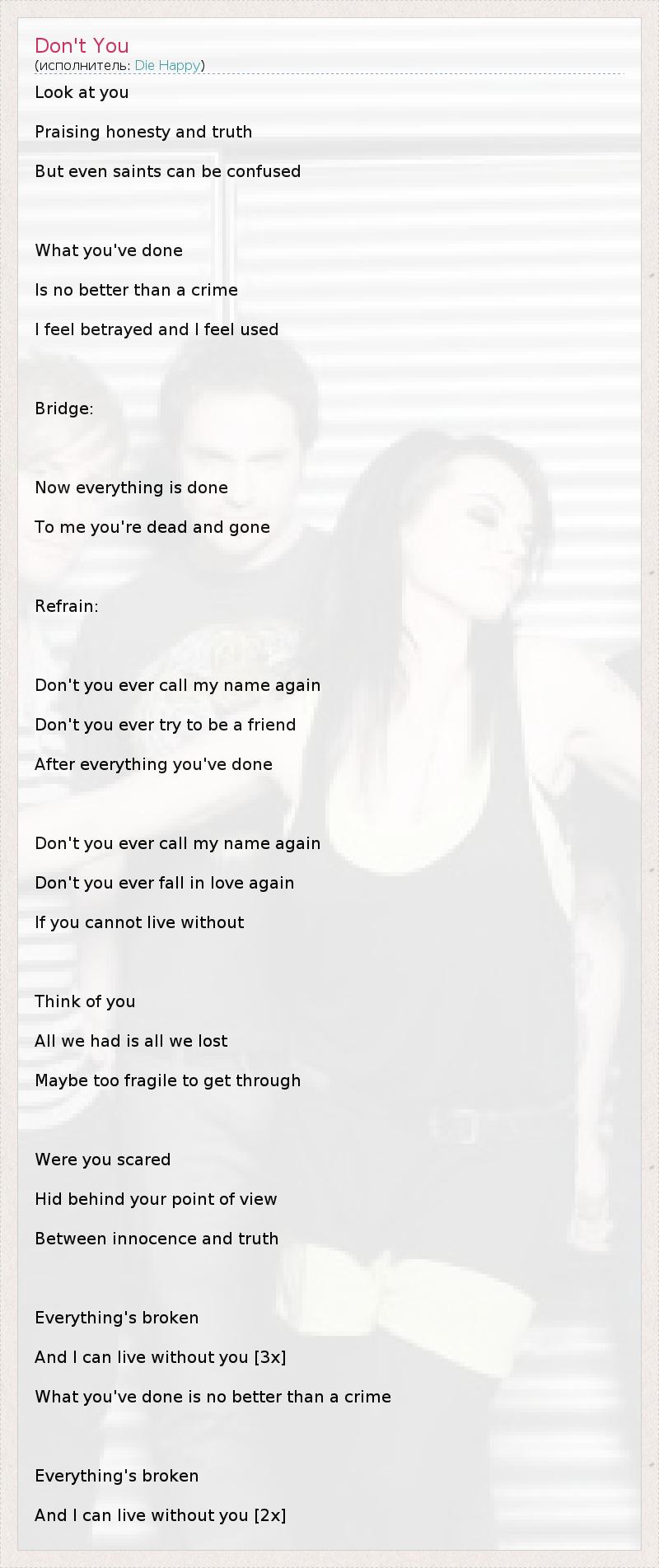 Look at you Praising honesty and truth But even saints can be confused What you've done Is no better than a crime I feel betrayed and I feel used Bridge: Now everything is done To me you're dead and gone Refrain: Don't you ever call my name again Don't you ever try to be a friend After everything you've done Don't you ever call my name again Don't you ever fall in love again If you cannot live without Think of you All we had is all we lost Maybe too fragile to get through Were you scared Hid behind your point of view Between innocence and truth Everything's broken And I can live without you [3x] What you've done is no better than a crime Everything's broken And I can live without you [2x]
