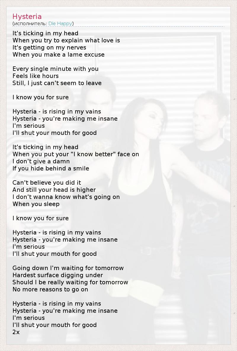 It's ticking in my head When you try to explain what love is It's getting on my nerves When you make a lame excuse Every single minute with you Feels like hours Still, I just can't seem to leave I know you for sure Hysteria - is rising in my vains Hysteria - you're making me insane I'm serious I'll shut your mouth for good It's ticking in my head When you put your "I know better" face on I don't give a damn If you hide behind a smile Can't believe you did it And still your head is higher I don't wanna know what's going on When you sleep I know you for sure Hysteria - is rising in my vains Hysteria - you're making me insane I'm serious I'll shut your mouth for good Going down I'm waiting for tomorrow Hardest surface digging under Should I be really waiting for tomorrow No more reasons to go on Hysteria - is rising in my vains Hysteria - you're making me insane I'm serious I'll shut your mouth for good 2x