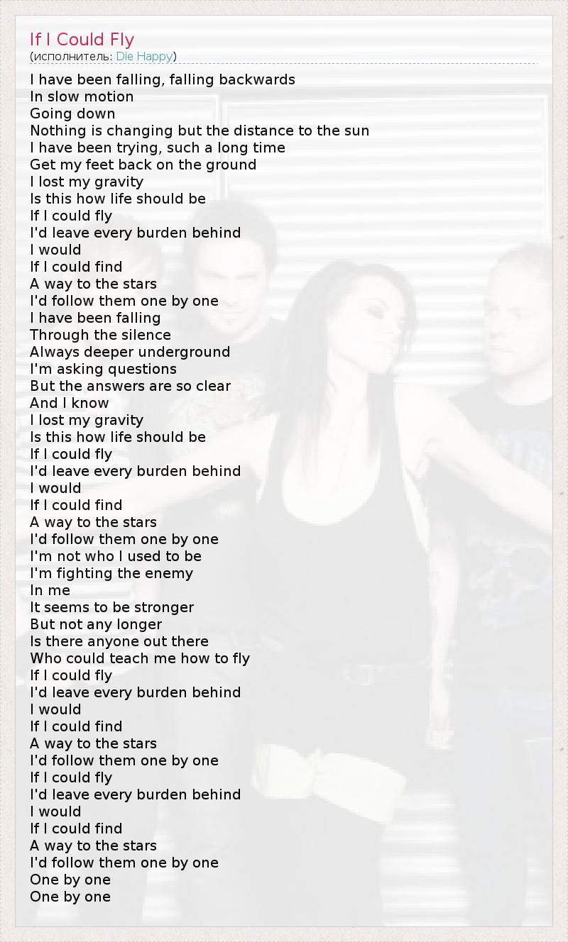 I have been falling, falling backwards In slow motion Going down Nothing is changing but the distance to the sun I have been trying, such a long time Get my feet back on the ground I lost my gravity Is this how life should be If I could fly I'd leave every burden behind I would If I could find A way to the stars I'd follow them one by one I have been falling Through the silence Always deeper underground I'm asking questions But the answers are so clear And I know I lost my gravity Is this how life should be If I could fly I'd leave every burden behind I would If I could find A way to the stars I'd follow them one by one I'm not who I used to be I'm fighting the enemy In me It seems to be stronger But not any longer Is there anyone out there Who could teach me how to fly If I could fly I'd leave every burden behind I would If I could find A way to the stars I'd follow them one by one If I could fly I'd leave every burden behind I would If I could find A way to the stars I'd follow them one by one One by one One by one
