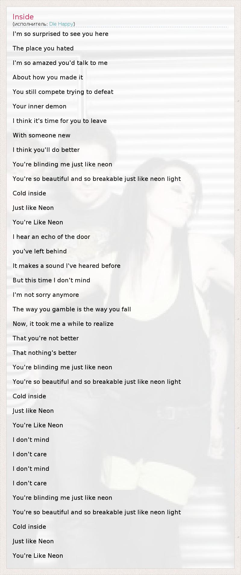 I'm so surprised to see you here The place you hated I'm so amazed you'd talk to me About how you made it You still compete trying to defeat Your inner demon I think it's time for you to leave With someone new I think you'll do better You're blinding me just like neon You're so beautiful and so breakable just like neon light Cold inside Just like Neon You're Like Neon I hear an echo of the door you've left behind It makes a sound I've heared before But this time I don't mind I'm not sorry anymore The way you gamble is the way you fall Now, it took me a while to realize That you're not better That nothing's better You're blinding me just like neon You're so beautiful and so breakable just like neon light Cold inside Just like Neon You're Like Neon I don't mind I don't care I don't mind I don't care You're blinding me just like neon You're so beautiful and so breakable just like neon light Cold inside Just like Neon You're Like Neon