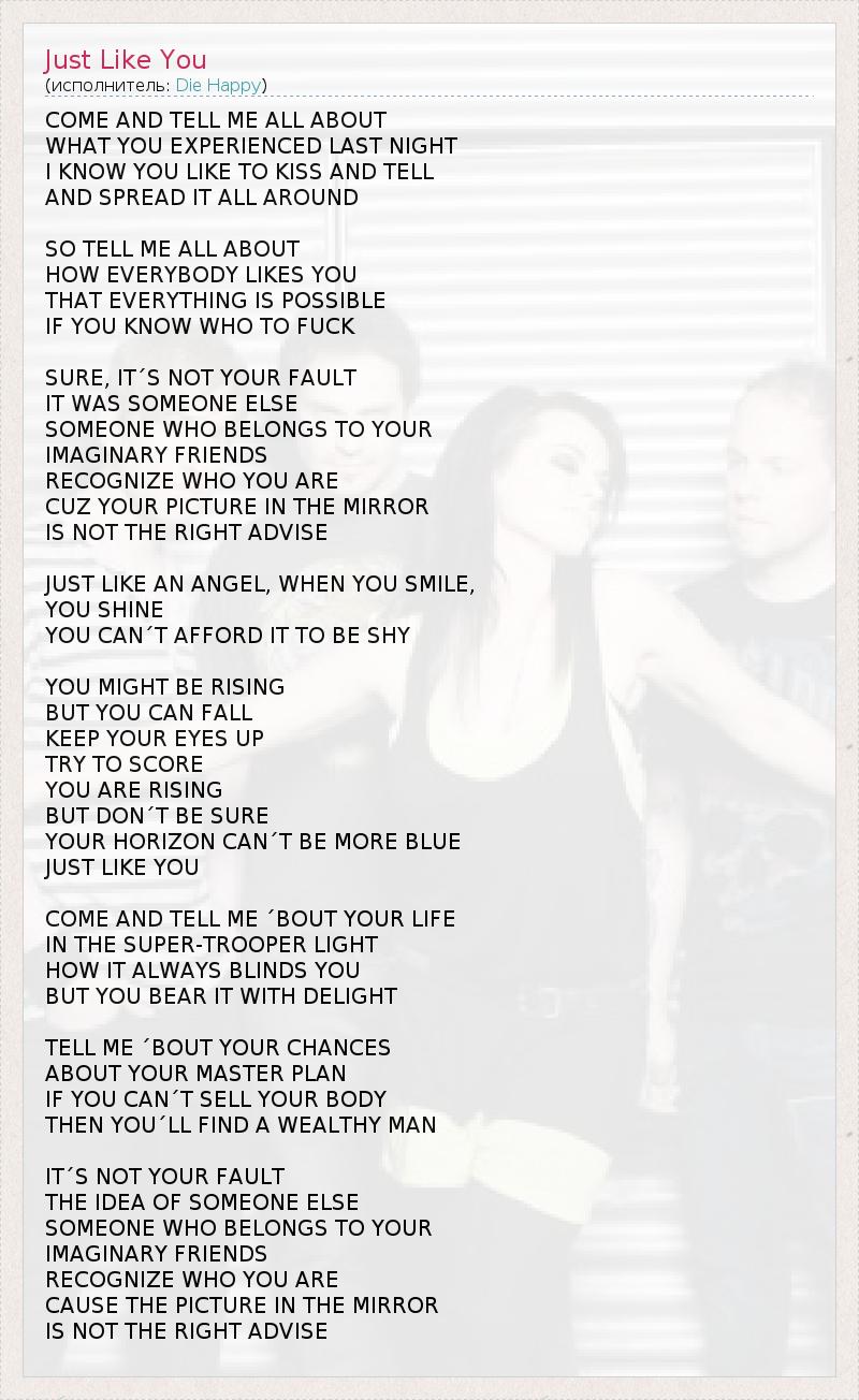 COME AND TELL ME ALL ABOUT WHAT YOU EXPERIENCED LAST NIGHT I KNOW YOU LIKE TO KISS AND TELL AND SPREAD IT ALL AROUND SO TELL ME ALL ABOUT HOW EVERYBODY LIKES YOU THAT EVERYTHING IS POSSIBLE IF YOU KNOW WHO TO FUCK SURE, IT´S NOT YOUR FAULT IT WAS SOMEONE ELSE SOMEONE WHO BELONGS TO YOUR IMAGINARY FRIENDS RECOGNIZE WHO YOU ARE CUZ YOUR PICTURE IN THE MIRROR IS NOT THE RIGHT ADVISE JUST LIKE AN ANGEL, WHEN YOU SMILE, YOU SHINE YOU CAN´T AFFORD IT TO BE SHY YOU MIGHT BE RISING BUT YOU CAN FALL KEEP YOUR EYES UP TRY TO SCORE YOU ARE RISING BUT DON´T BE SURE YOUR HORIZON CAN´T BE MORE BLUE JUST LIKE YOU COME AND TELL ME ´BOUT YOUR LIFE IN THE SUPER-TROOPER LIGHT HOW IT ALWAYS BLINDS YOU BUT YOU BEAR IT WITH DELIGHT TELL ME ´BOUT YOUR CHANCES ABOUT YOUR MASTER PLAN IF YOU CAN´T SELL YOUR BODY THEN YOU´LL FIND A WEALTHY MAN IT´S NOT YOUR FAULT THE IDEA OF SOMEONE ELSE SOMEONE WHO BELONGS TO YOUR IMAGINARY FRIENDS RECOGNIZE WHO YOU ARE CAUSE THE PICTURE IN THE MIRROR IS NOT THE RIGHT ADVISE