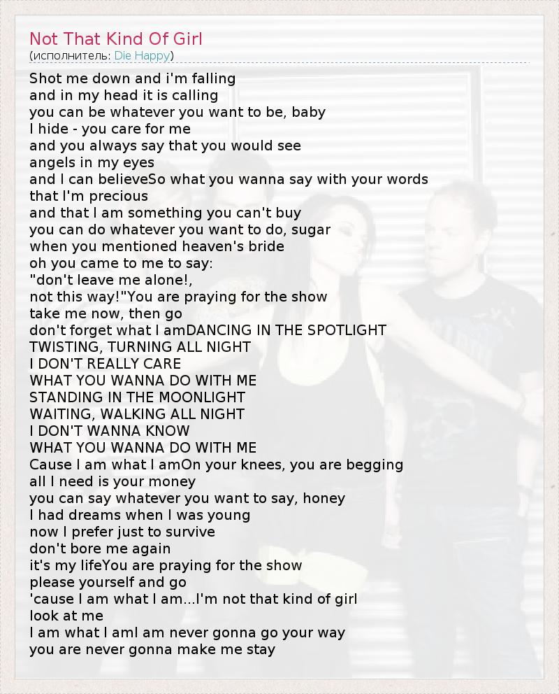 Shot me down and i'm falling and in my head it is calling you can be whatever you want to be, baby I hide - you care for me and you always say that you would see angels in my eyes and I can believeSo what you wanna say with your words that I'm precious and that I am something you can't buy you can do whatever you want to do, sugar when you mentioned heaven's bride oh you came to me to say: "don't leave me alone!, not this way!"You are praying for the show take me now, then go don't forget what I amDANCING IN THE SPOTLIGHT TWISTING, TURNING ALL NIGHT I DON'T REALLY CARE WHAT YOU WANNA DO WITH ME STANDING IN THE MOONLIGHT WAITING, WALKING ALL NIGHT I DON'T WANNA KNOW WHAT YOU WANNA DO WITH ME Cause I am what I amOn your knees, you are begging all I need is your money you can say whatever you want to say, honey I had dreams when I was young now I prefer just to survive don't bore me again it's my lifeYou are praying for the show please yourself and go 'cause I am what I am...I'm not that kind of girl look at me I am what I amI am never gonna go your way you are never gonna make me stay