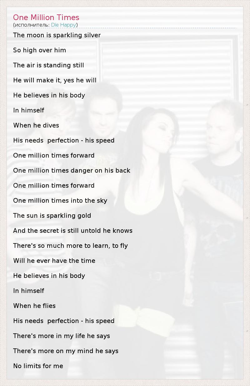 The moon is sparkling silver So high over him The air is standing still He will make it, yes he will He believes in his body In himself When he dives His needs perfection - his speed One million times forward One million times danger on his back One million times forward One million times into the sky The sun is sparkling gold And the secret is still untold he knows There's so much more to learn, to fly Will he ever have the time He believes in his body In himself When he flies His needs perfection - his speed There's more in my life he says There's more on my mind he says No limits for me