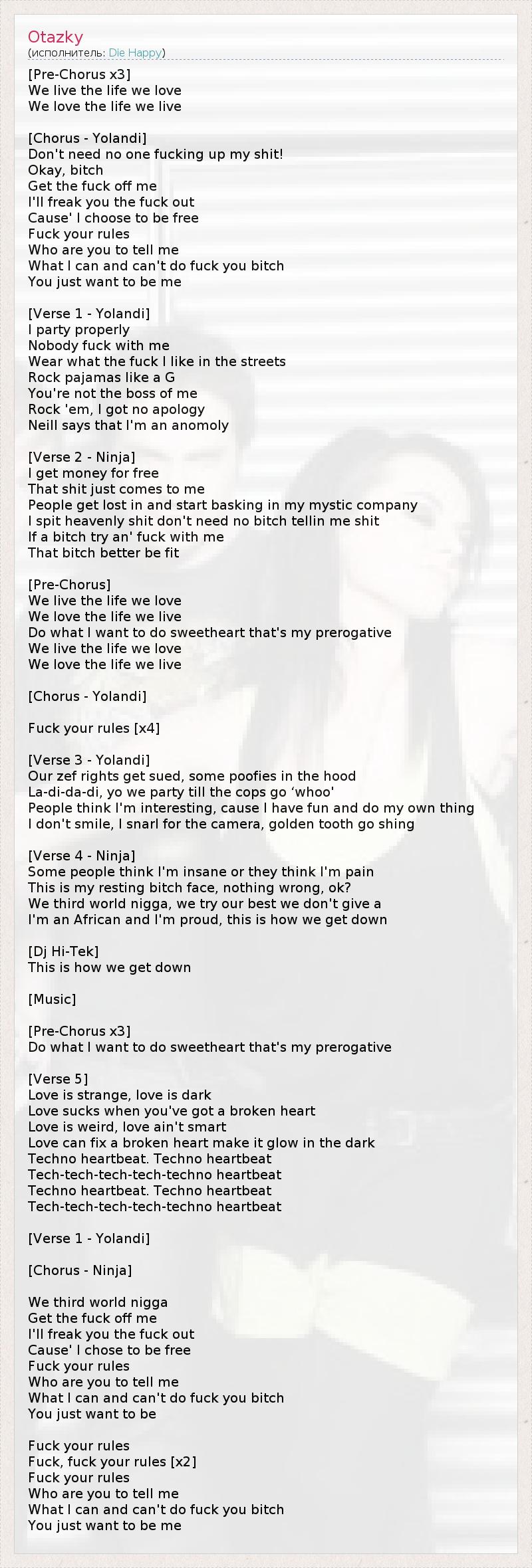 [Пред-Припев х3] Мы живем жизнь, которую мы любим, Мы любим жизнь, которой мы живем! [Припев - Йоланди] Мы не нуждаемся в тех, кому не нравится наше д*рьмо! Хорошо, шл*шка, Отъ*бись от меня! Я тебя напугаю до уср*чки, Потому что я выбираю свободу! К черту ваши правила! Кто ты такая, чтобы указывать мне, Что я могу и не могу сделать, д*ра? Ты просто хочешь быть мной! [Стих 1 - Йоланди] Я круто отрываюсь, Никому до меня не д*баться, Ношу на улице все, что, черт подери, захочу, Тусуюсь в кигуруми 2, как гангстер! Ты мне не босс, Прид*рок, я не стану извиняться за свои выходки, Ведь Нил 3 сказал, что я – аномальна! [Стих 2 - Ниндзя] Я получаю деньги просто так, Это де*ьмо просто течет ко мне! Люди подсаживаются и начинают балдеть в моей мистической компании, Я плююсь поистине небесным де*ьмом и ни одна шл*шка мне не указ! Если шл*шка хочет д*баться до меня, Ей лучше иметь высокий рейтинг! [Пред-Припев х3] Мы живем жизнь, которую мы любим, Мы любим жизнь, которой мы живем! Творю, что хочу, милая, это моя прерогатива! Мы живем жизнь, которую мы любим, Мы любим жизнь, которой мы живем! [Припев - Йоланди] К черту ваши правила [x4] [Стих 3 - Йоланди] Наши ZEF-права 4 не отнять, некоторым придуркам этого не понять, Ля-ди-да-ди, будем отрываться, пока копы не крикнут "Воу"! Люди считают меня интересной, потому что я умею тусить и делать что-то свое, Я не улыбаюсь, я рычу на камеру, сверкая своим золотым зубом! [Стих 4 - Ниндзя] Некоторые люди думают, что я псих или они думают, что мне больно, Это покой на моем лице, с*ка, ничего плохого, ок? Мы нигг*ры третьего мира, у нас мы пробуем лучшее и ни с кем не делимся! 5 Я африканец и я горжусь тем, под что меня колбасит! [Диджей Хай-Тек] Под что меня колбасит! [Проигрыш] [Пред-Припев х3] Творю, что хочу, милая, это моя прерогатива! [Стих 5] Любовь – странная, любовь – темна, Любовь отстой, когда у тебя разбитое сердце Любовь – фатальна, любовь – слепа, Любовь может починить разбитое сердце, заставить светиться в темноте, Техно пульс, техно пульс, Тех-тех-тех-тех-техно пульс, Техно пульс, техно пульс, Тех-тех-тех-тех-техно пульс... [Стих 1 - Йоланди] [Припев - Ниндзя] Мы нигг*ры третьего мира, Отъ*бись от меня! Я тебя напугаю до уср*чки, Потому что я выбираю свободу! К черту ваши правила! Кто ты такая, чтобы указывать мне, Что я могу и не могу сделать, д*ра? Ты просто хочешь быть мной! К черту ваши правила! К черту, к черту ваши правила! [x2] К черту ваши правила! Кто ты такая, чтобы указывать мне, Что я могу и не могу сделать, д*ра? Ты просто хочешь быть мной! 1 Игра слов, "happy-go-lucky" в переводе означает "беззаботные" 2 Кигуруми (Kigurumi) – это оригинальные кавайные пижамные костюмчики мультяшных героев и зверей для взрослых 3 Нил Бломкамп — южноафриканский и канадский режиссёр и 3D-аниматор, работающий в жанрах научной фантастики и боевика 4 Идеология Zef описывается, как вычурное совмещение убогости модерна с устаревшими, отмирающими элементами культуры 5 Для мировой нелегальной торговли наркотиками основными производителями являются страны "третьего мира"
