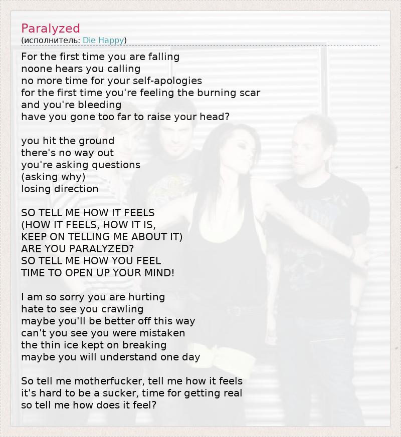 For the first time you are falling noone hears you calling no more time for your self-apologies for the first time you're feeling the burning scar and you're bleeding have you gone too far to raise your head? you hit the ground there's no way out you're asking questions (asking why) losing direction SO TELL ME HOW IT FEELS (HOW IT FEELS, HOW IT IS, KEEP ON TELLING ME ABOUT IT) ARE YOU PARALYZED? SO TELL ME HOW YOU FEEL TIME TO OPEN UP YOUR MIND! I am so sorry you are hurting hate to see you crawling maybe you'll be better off this way can't you see you were mistaken the thin ice kept on breaking maybe you will understand one day So tell me motherfucker, tell me how it feels it's hard to be a sucker, time for getting real so tell me how does it feel?