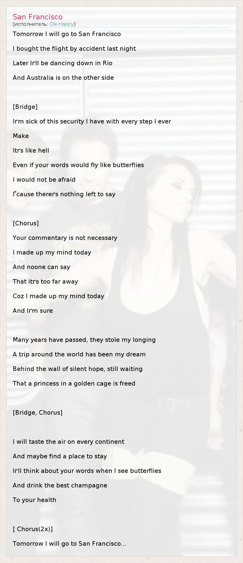 Tomorrow I will go to San Francisco I bought the flight by accident last night Later Iґll be dancing down in Rio And Australia is on the other side [Bridge] Iґm sick of this security I have with every step I ever Make Itґs like hell Even if your words would fly like butterflies I would not be afraid Ґcause thereґs nothing left to say [Chorus] Your commentary is not necessary I made up my mind today And noone can say That itґs too far away Coz I made up my mind today And Iґm sure Many years have passed, they stole my longing A trip around the world has been my dream Behind the wall of silent hope, still waiting That a princess in a golden cage is freed [Bridge, Chorus] I will taste the air on every continent And maybe find a place to stay Iґll think about your words when I see butterflies And drink the best champagne To your health [ Chorus(2x)] Tomorrow I will go to San Francisco...