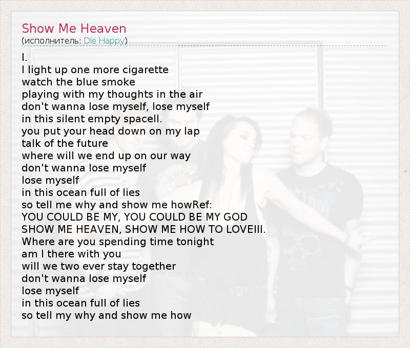 I. I light up one more cigarette watch the blue smoke playing with my thoughts in the air don't wanna lose myself, lose myself in this silent empty spaceII. you put your head down on my lap talk of the future where will we end up on our way don't wanna lose myself lose myself in this ocean full of lies so tell me why and show me howRef: YOU COULD BE MY, YOU COULD BE MY GOD SHOW ME HEAVEN, SHOW ME HOW TO LOVEIII. Where are you spending time tonight am I there with you will we two ever stay together don't wanna lose myself lose myself in this ocean full of lies so tell my why and show me how