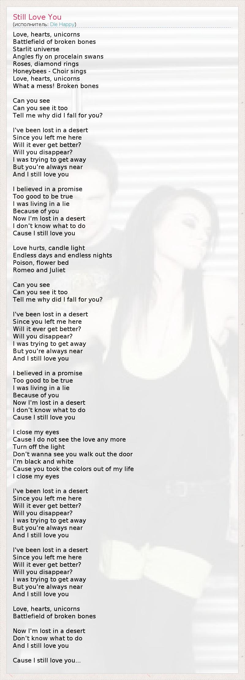 Love, hearts, unicorns Battlefield of broken bones Starlit universe Angles fly on procelain swans Roses, diamond rings Honeybees - Choir sings Love, hearts, unicorns What a mess! Broken bones Can you see Can you see it too Tell me why did I fall for you? I've been lost in a desert Since you left me here Will it ever get better? Will you disappear? I was trying to get away But you're always near And I still love you I believed in a promise Too good to be true I was living in a lie Because of you Now I'm lost in a desert I don't know what to do Cause I still love you Love hurts, candle light Endless days and endless nights Poison, flower bed Romeo and Juliet Can you see Can you see it too Tell me why did I fall for you? I've been lost in a desert Since you left me here Will it ever get better? Will you disappear? I was trying to get away But you're always near And I still love you I believed in a promise Too good to be true I was living in a lie Because of you Now I'm lost in a desert I don't know what to do Cause I still love you I close my eyes Cause I do not see the love any more Turn off the light Don't wanna see you walk out the door I'm black and white Cause you took the colors out of my life I close my eyes I've been lost in a desert Since you left me here Will it ever get better? Will you disappear? I was trying to get away But you're always near And I still love you I've been lost in a desert Since you left me here Will it ever get better? Will you disappear? I was trying to get away But you're always near And I still love you Love, hearts, unicorns Battlefield of broken bones Now I'm lost in a desert Don't know what to do And I still love you Cause I still love you...