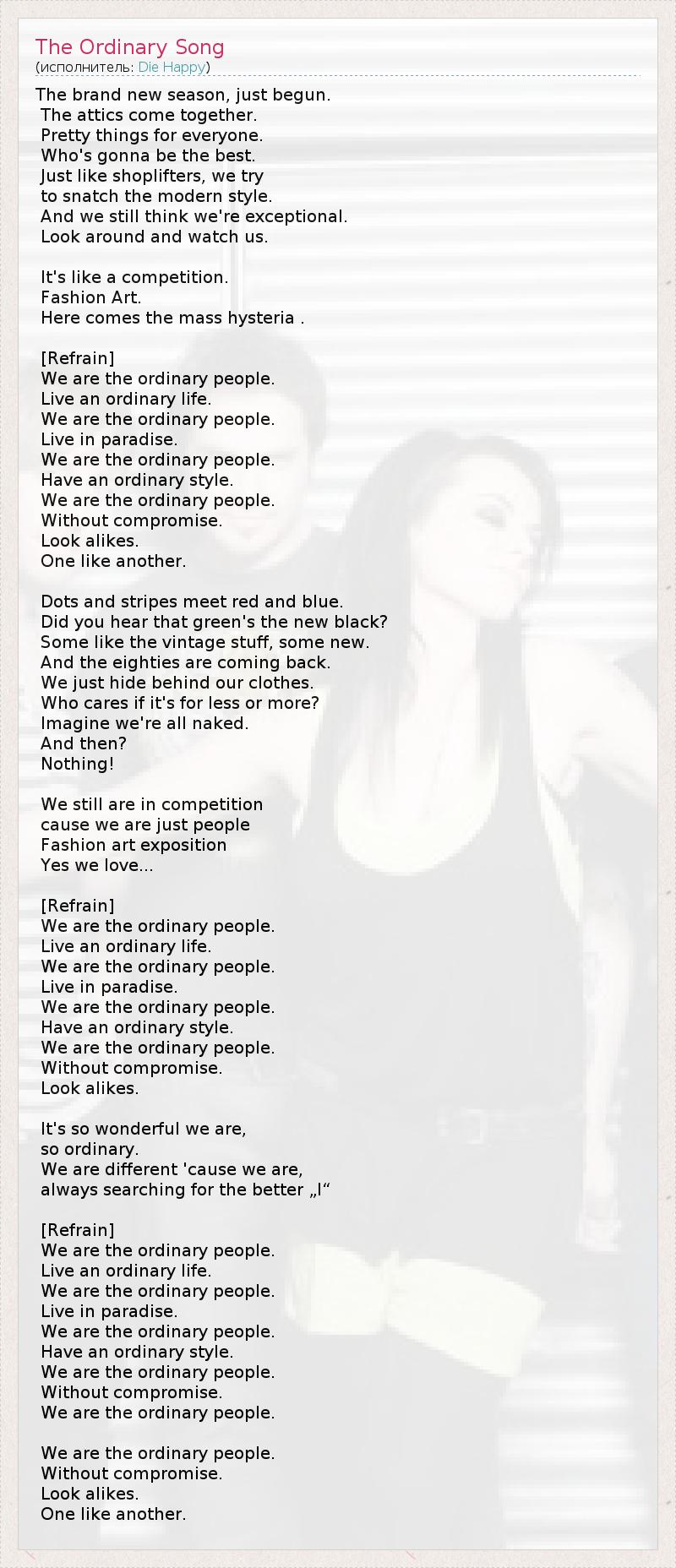 The brand new season, just begun. The attics come together. Pretty things for everyone. Who's gonna be the best. Just like shoplifters, we try to snatch the modern style. And we still think we're exceptional. Look around and watch us. It's like a competition. Fashion Art. Here comes the mass hysteria . [Refrain] We are the ordinary people. Live an ordinary life. We are the ordinary people. Live in paradise. We are the ordinary people. Have an ordinary style. We are the ordinary people. Without compromise. Look alikes. One like another. Dots and stripes meet red and blue. Did you hear that green's the new black? Some like the vintage stuff, some new. And the eighties are coming back. We just hide behind our clothes. Who cares if it's for less or more? Imagine we're all naked. And then? Nothing! We still are in competition cause we are just people Fashion art exposition Yes we love... [Refrain] We are the ordinary people. Live an ordinary life. We are the ordinary people. Live in paradise. We are the ordinary people. Have an ordinary style. We are the ordinary people. Without compromise. Look alikes. It's so wonderful we are, so ordinary. We are different 'cause we are, always searching for the better „I“ [Refrain] We are the ordinary people. Live an ordinary life. We are the ordinary people. Live in paradise. We are the ordinary people. Have an ordinary style. We are the ordinary people. Without compromise. We are the ordinary people. We are the ordinary people. Without compromise. Look alikes. One like another.