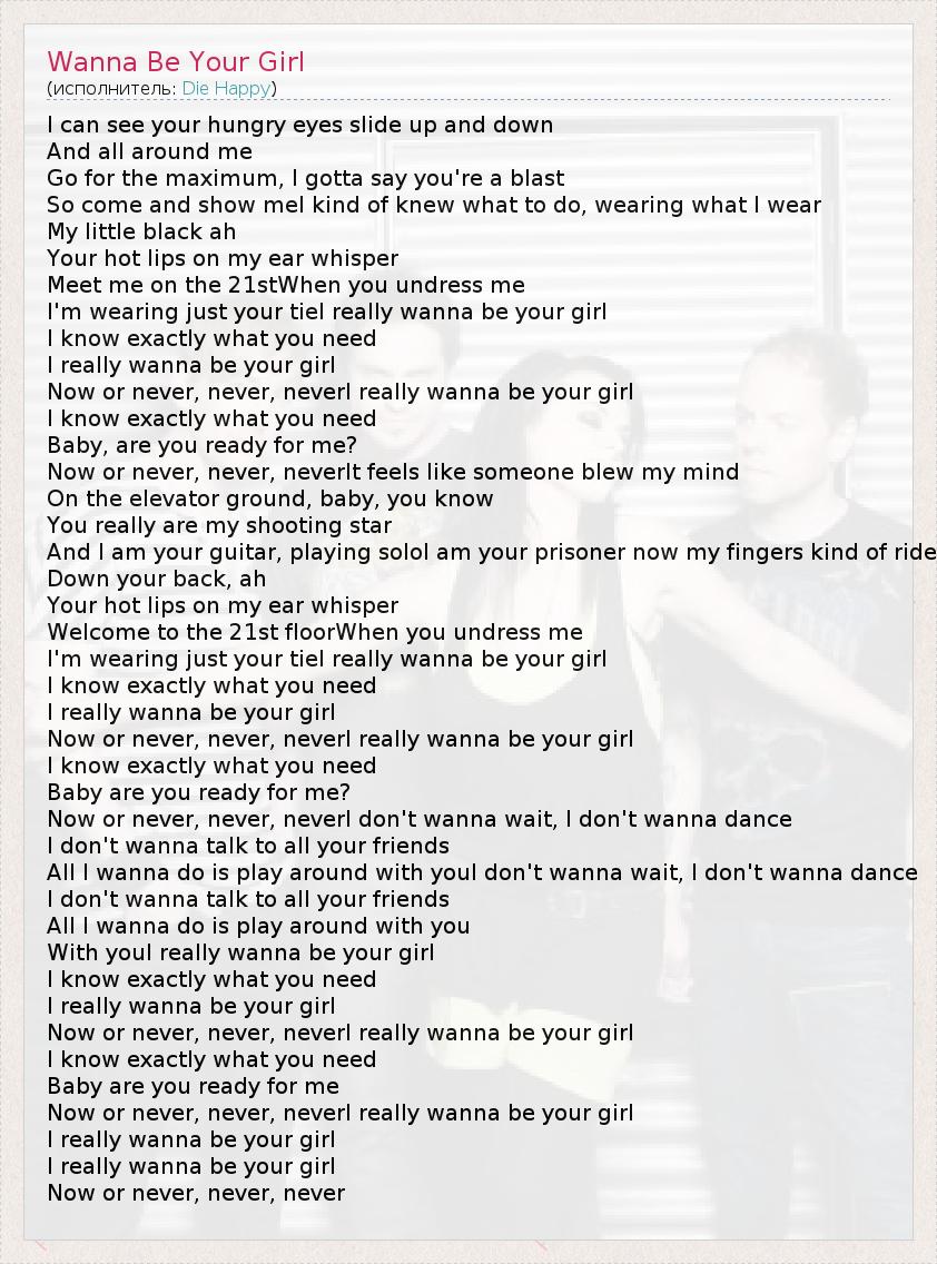 I can see your hungry eyes slide up and down And all around me Go for the maximum, I gotta say you're a blast So come and show meI kind of knew what to do, wearing what I wear My little black ah Your hot lips on my ear whisper Meet me on the 21stWhen you undress me I'm wearing just your tieI really wanna be your girl I know exactly what you need I really wanna be your girl Now or never, never, neverI really wanna be your girl I know exactly what you need Baby, are you ready for me? Now or never, never, neverIt feels like someone blew my mind On the elevator ground, baby, you know You really are my shooting star And I am your guitar, playing soloI am your prisoner now my fingers kind of ride Down your back, ah Your hot lips on my ear whisper Welcome to the 21st floorWhen you undress me I'm wearing just your tieI really wanna be your girl I know exactly what you need I really wanna be your girl Now or never, never, neverI really wanna be your girl I know exactly what you need Baby are you ready for me? Now or never, never, neverI don't wanna wait, I don't wanna dance I don't wanna talk to all your friends All I wanna do is play around with youI don't wanna wait, I don't wanna dance I don't wanna talk to all your friends All I wanna do is play around with you With youI really wanna be your girl I know exactly what you need I really wanna be your girl Now or never, never, neverI really wanna be your girl I know exactly what you need Baby are you ready for me Now or never, never, neverI really wanna be your girl I really wanna be your girl I really wanna be your girl Now or never, never, never