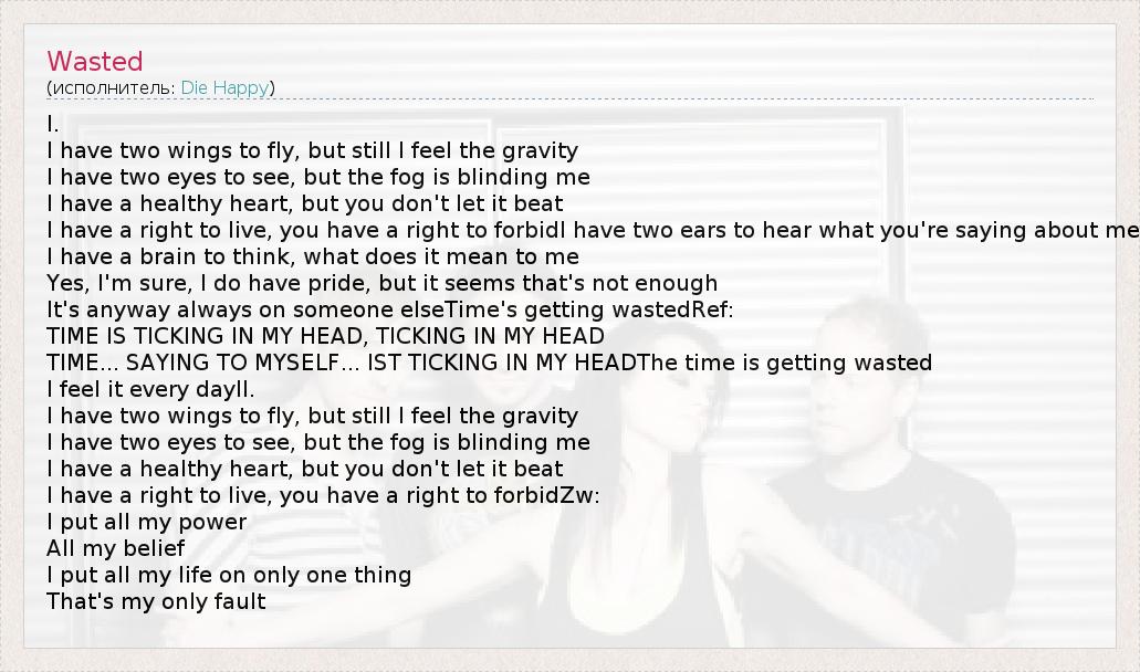 I. I have two wings to fly, but still I feel the gravity I have two eyes to see, but the fog is blinding me I have a healthy heart, but you don't let it beat I have a right to live, you have a right to forbidI have two ears to hear what you're saying about me I have a brain to think, what does it mean to me Yes, I'm sure, I do have pride, but it seems that's not enough It's anyway always on someone elseTime's getting wastedRef: TIME IS TICKING IN MY HEAD, TICKING IN MY HEAD TIME... SAYING TO MYSELF... IST TICKING IN MY HEADThe time is getting wasted I feel it every dayII. I have two wings to fly, but still I feel the gravity I have two eyes to see, but the fog is blinding me I have a healthy heart, but you don't let it beat I have a right to live, you have a right to forbidZw: I put all my power All my belief I put all my life on only one thing That's my only fault