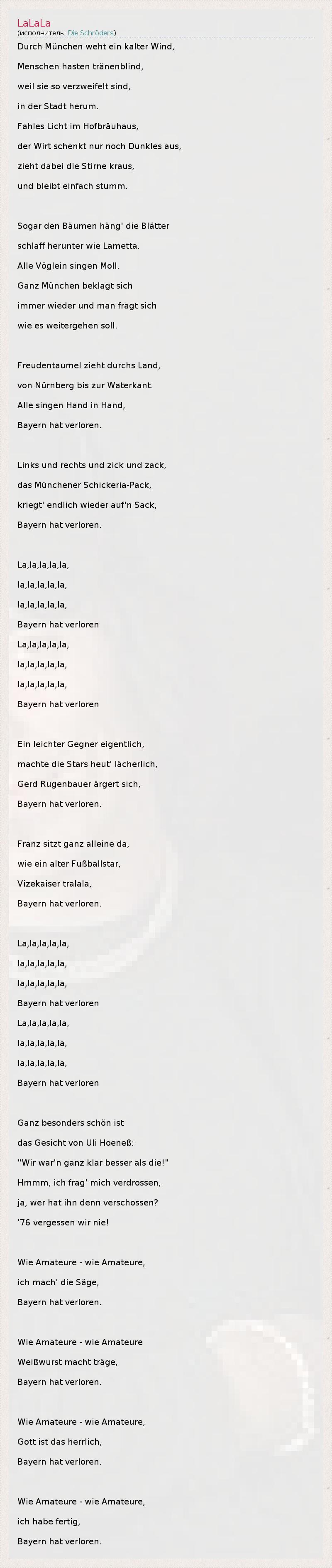 Durch München weht ein kalter Wind, Menschen hasten tränenblind, weil sie so verzweifelt sind, in der Stadt herum. Fahles Licht im Hofbräuhaus, der Wirt schenkt nur noch Dunkles aus, zieht dabei die Stirne kraus, und bleibt einfach stumm. Sogar den Bäumen häng' die Blätter schlaff herunter wie Lametta. Alle Vöglein singen Moll. Ganz München beklagt sich immer wieder und man fragt sich wie es weitergehen soll. Freudentaumel zieht durchs Land, von Nürnberg bis zur Waterkant. Alle singen Hand in Hand, Bayern hat verloren. Links und rechts und zick und zack, das Münchener Schickeria-Pack, kriegt' endlich wieder auf'n Sack, Bayern hat verloren. La,la,la,la,la, la,la,la,la,la, la,la,la,la,la, Bayern hat verloren La,la,la,la,la, la,la,la,la,la, la,la,la,la,la, Bayern hat verloren Ein leichter Gegner eigentlich, machte die Stars heut' lächerlich, Gerd Rugenbauer ärgert sich, Bayern hat verloren. Franz sitzt ganz alleine da, wie ein alter Fußballstar, Vizekaiser tralala, Bayern hat verloren. La,la,la,la,la, la,la,la,la,la, la,la,la,la,la, Bayern hat verloren La,la,la,la,la, la,la,la,la,la, la,la,la,la,la, Bayern hat verloren Ganz besonders schön ist das Gesicht von Uli Hoeneß: "Wir war'n ganz klar besser als die!" Hmmm, ich frag' mich verdrossen, ja, wer hat ihn denn verschossen? '76 vergessen wir nie! Wie Amateure - wie Amateure, ich mach' die Säge, Bayern hat verloren. Wie Amateure - wie Amateure Weißwurst macht träge, Bayern hat verloren. Wie Amateure - wie Amateure, Gott ist das herrlich, Bayern hat verloren. Wie Amateure - wie Amateure, ich habe fertig, Bayern hat verloren.