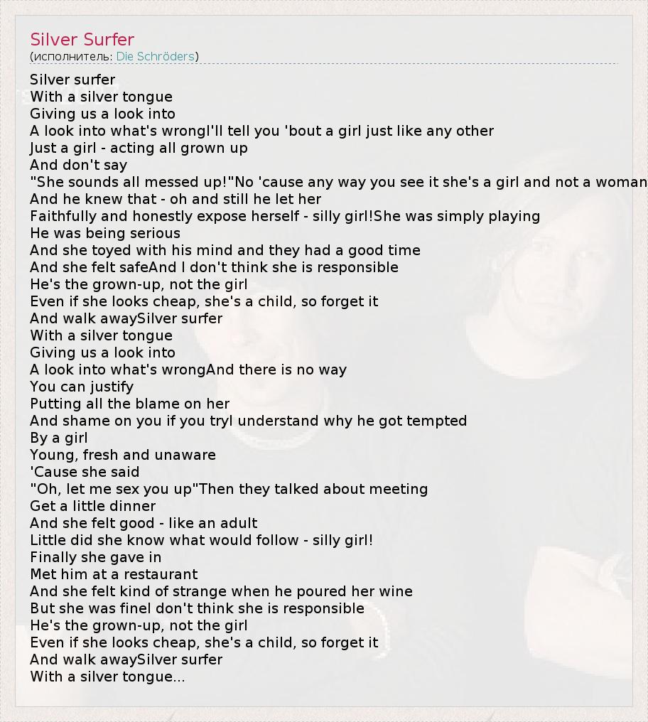 Silver surfer With a silver tongue Giving us a look into A look into what's wrongI'll tell you 'bout a girl just like any other Just a girl - acting all grown up And don't say "She sounds all messed up!"No 'cause any way you see it she's a girl and not a woman And he knew that - oh and still he let her Faithfully and honestly expose herself - silly girl!She was simply playing He was being serious And she toyed with his mind and they had a good time And she felt safeAnd I don't think she is responsible He's the grown-up, not the girl Even if she looks cheap, she's a child, so forget it And walk awaySilver surfer With a silver tongue Giving us a look into A look into what's wrongAnd there is no way You can justify Putting all the blame on her And shame on you if you tryI understand why he got tempted By a girl Young, fresh and unaware 'Cause she said "Oh, let me sex you up"Then they talked about meeting Get a little dinner And she felt good - like an adult Little did she know what would follow - silly girl! Finally she gave in Met him at a restaurant And she felt kind of strange when he poured her wine But she was fineI don't think she is responsible He's the grown-up, not the girl Even if she looks cheap, she's a child, so forget it And walk awaySilver surfer With a silver tongue...