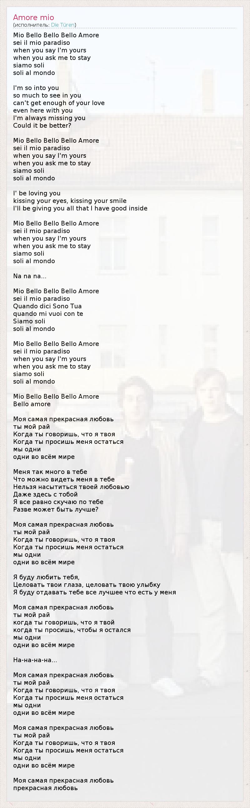 Mio Bello Bello Bello Amore sei il mio paradiso when you say I'm yours when you ask me to stay siamo soli soli al mondo I'm so into you so much to see in you can't get enough of your love even here with you I'm always missing you Could it be better? Mio Bello Bello Bello Amore sei il mio paradiso when you say I'm yours when you ask me to stay siamo soli soli al mondo I' be loving you kissing your eyes, kissing your smile I'll be giving you all that I have good inside Mio Bello Bello Bello Amore sei il mio paradiso when you say I'm yours when you ask me to stay siamo soli soli al mondo Na na na... Mio Bello Bello Bello Amore sei il mio paradiso Quando dici Sono Tua quando mi vuoi con te Siamo soli soli al mondo Mio Bello Bello Bello Amore sei il mio paradiso when you say I'm yours when you ask me to stay siamo soli soli al mondo Mio Bello Bello Bello Amore Bello amore Моя самая прекрасная любовь ты мой рай Когда ты говоришь, что я твоя Когда ты просишь меня остаться мы одни одни во всём мире Меня так много в тебе Что можно видеть меня в тебе Нельзя насытиться твоей любовью Даже здесь с тобой Я все равно скучаю по тебе Разве может быть лучше? Моя самая прекрасная любовь ты мой рай Когда ты говоришь, что я твоя Когда ты просишь меня остаться мы одни одни во всём мире Я буду любить тебя, Целовать твои глаза, целовать твою улыбку Я буду отдавать тебе все лучшее что есть у меня Моя самая прекрасная любовь ты мой рай когда ты говоришь, что я твой когда ты просишь, чтобы я остался мы одни одни во всём мире На-на-на-на... Моя самая прекрасная любовь ты мой рай Когда ты говоришь, что я твоя Когда ты просишь меня остаться мы одни одни во всём мире Моя самая прекрасная любовь ты мой рай Когда ты говоришь, что я твоя Когда ты просишь меня остаться мы одни одни во всём мире Моя самая прекрасная любовь прекрасная любовь