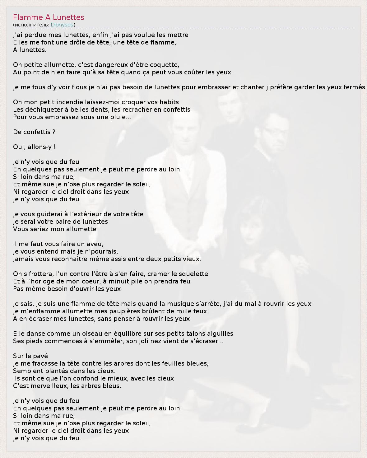 А как ты думаешь, о чем песня "Flamme A Lunettes" ?