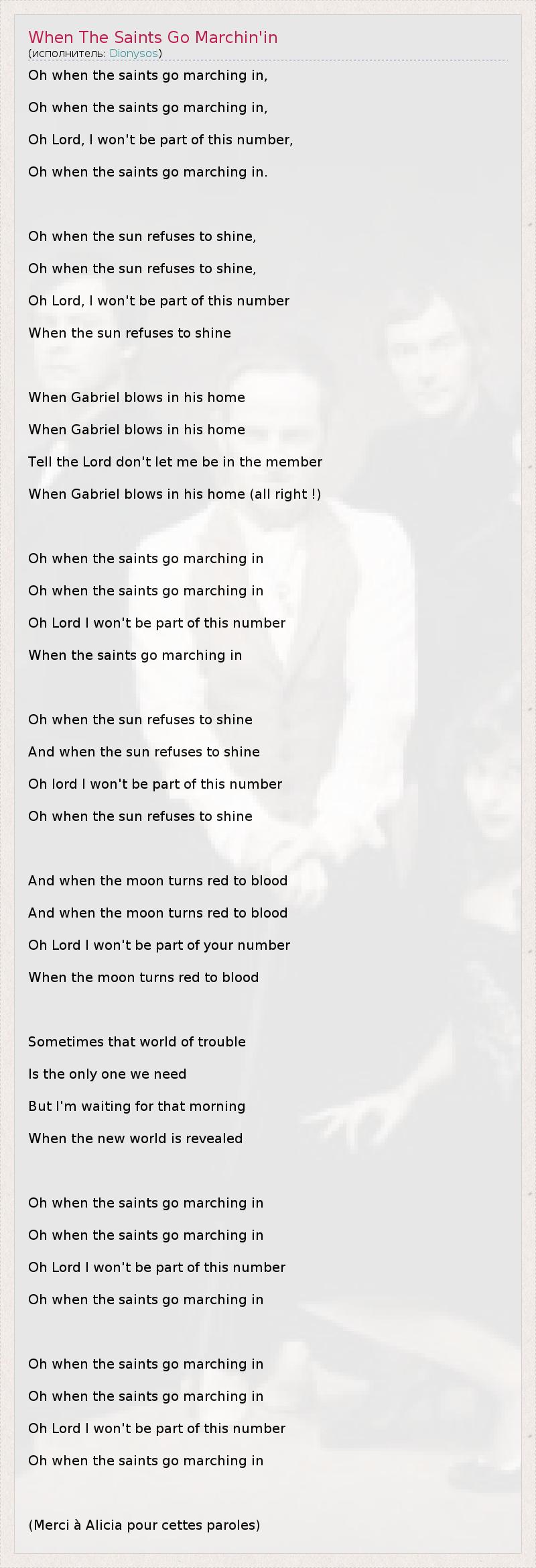 Oh when the saints go marching in, Oh when the saints go marching in, Oh Lord, I won't be part of this number, Oh when the saints go marching in. Oh when the sun refuses to shine, Oh when the sun refuses to shine, Oh Lord, I won't be part of this number When the sun refuses to shine When Gabriel blows in his home When Gabriel blows in his home Tell the Lord don't let me be in the member When Gabriel blows in his home (all right !) Oh when the saints go marching in Oh when the saints go marching in Oh Lord I won't be part of this number When the saints go marching in Oh when the sun refuses to shine And when the sun refuses to shine Oh lord I won't be part of this number Oh when the sun refuses to shine And when the moon turns red to blood And when the moon turns red to blood Oh Lord I won't be part of your number When the moon turns red to blood Sometimes that world of trouble Is the only one we need But I'm waiting for that morning When the new world is revealed Oh when the saints go marching in Oh when the saints go marching in Oh Lord I won't be part of this number Oh when the saints go marching in Oh when the saints go marching in Oh when the saints go marching in Oh Lord I won't be part of this number Oh when the saints go marching in (Merci à Alicia pour cettes paroles)