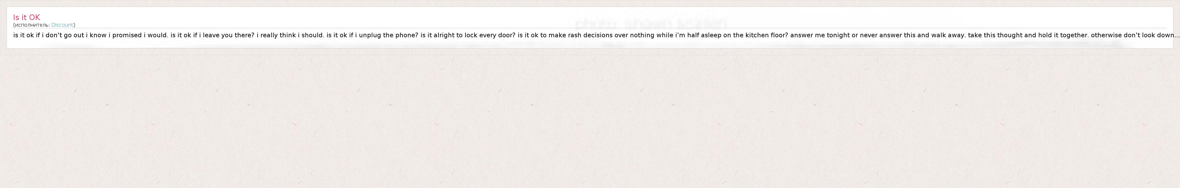 is it ok if i don't go out i know i promised i would. is it ok if i leave you there? i really think i should. is it ok if i unplug the phone? is it alright to lock every door? is it ok to make rash decisions over nothing while i'm half asleep on the kitchen floor? answer me tonight or never answer this and walk away. take this thought and hold it together. otherwise don't look down...