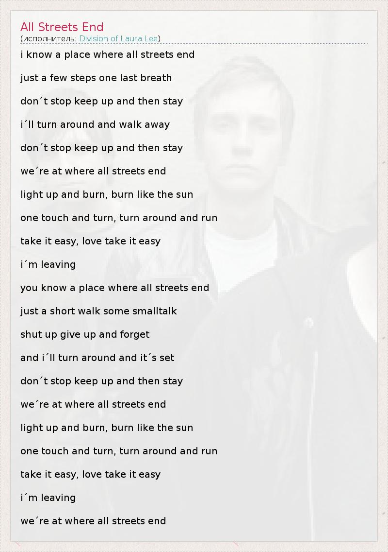 i know a place where all streets end just a few steps one last breath don´t stop keep up and then stay i´ll turn around and walk away don´t stop keep up and then stay we´re at where all streets end light up and burn, burn like the sun one touch and turn, turn around and run take it easy, love take it easy i´m leaving you know a place where all streets end just a short walk some smalltalk shut up give up and forget and i´ll turn around and it´s set don´t stop keep up and then stay we´re at where all streets end light up and burn, burn like the sun one touch and turn, turn around and run take it easy, love take it easy i´m leaving we´re at where all streets end