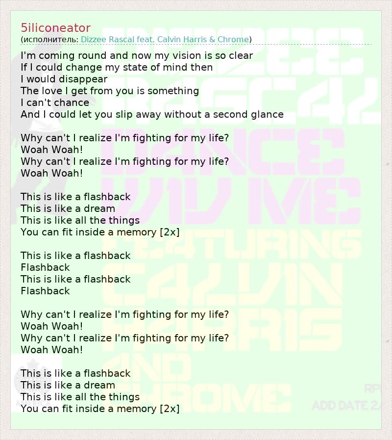 I'm coming round and now my vision is so clear If I could change my state of mind then I would disappear The love I get from you is something I can't chance And I could let you slip away without a second glance Why can't I realize I'm fighting for my life? Woah Woah! Why can't I realize I'm fighting for my life? Woah Woah! This is like a flashback This is like a dream This is like all the things You can fit inside a memory [2x] This is like a flashback Flashback This is like a flashback Flashback Why can't I realize I'm fighting for my life? Woah Woah! Why can't I realize I'm fighting for my life? Woah Woah! This is like a flashback This is like a dream This is like all the things You can fit inside a memory [2x]