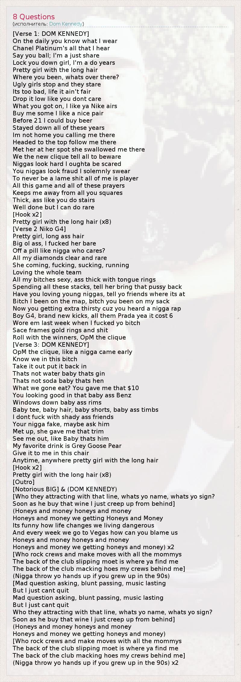 [Verse 1: DOM KENNEDY] On the daily you know what I wear Chanel Platinum's all that I hear Say you ball; I'm a just share Lock you down girl, I'm a do years Pretty girl with the long hair Where you been, whats over there? Ugly girls stop and they stare Its too bad, life it ain't fair Drop it low like you dont care What you got on, I like ya Nike airs Buy me some I like a nice pair Before 21 I could buy beer Stayed down all of these years Im not home you calling me there Headed to the top follow me there Met her at her spot she swallowed me there We the new clique tell all to beware Niggas look hard I oughta be scared You niggas look fraud I solemnly swear To never be a lame shit all of me is player All this game and all of these prayers Keeps me away from all you squares Thick, ass like you do stairs Well done but I can do rare [Hook x2] Pretty girl with the long hair (x8) [Verse 2 Niko G4] Pretty girl, long ass hair Big ol ass, I fucked her bare Off a pill like nigga who cares? All my diamonds clear and rare She coming, fucking, sucking, running Loving the whole team All my bitches sexy, ass thick with tongue rings Spending all these stacks, tell her bring that pussy back Have you loving young niggas, tell yo friends where its at Bitch I been on the map, bitch you been on my sack Now you getting extra thirsty cuz you heard a nigga rap Boy G4, brand new kicks, all them Prada yea it cost 6 Wore em last week when I fucked yo bitch Sace frames gold rings and shit Roll with the winners, OpM the clique [Verse 3: DOM KENNEDY] OpM the clique, like a nigga came early Know we in this bitch Take it out put it back in Thats not water baby thats gin Thats not soda baby thats hen What we gone eat? You gave me that $10 You looking good in that baby ass Benz Windows down baby ass rims Baby tee, baby hair, baby shorts, baby ass timbs I dont fuck with shady ass friends Your nigga fake, maybe ask him Met up, she gave me that trim See me out, like Baby thats him My favorite drink is Grey Goose Pear Give it to me in this chair Anytime, anywhere pretty girl with the long hair [Hook x2] Pretty girl with the long hair (x8) [Outro] [Notorious BIG] & (DOM KENNEDY) [Who they attracting with that line, whats yo name, whats yo sign? Soon as he buy that wine I just creep up from behind] (Honeys and money honeys and money Honeys and money we getting Honeys and Money Its funny how life changes we living dangerous And every week we go to Vegas how can you blame us Honeys and money honeys and money Honeys and money we getting honeys and money) x2 [Who rock crews and make moves with all the mommys The back of the club slipping moet is where ya find me The back of the club macking hoes my crews behind me] (Nigga throw yo hands up if you grew up in the 90s) [Mad question asking, blunt passing, music lasting But I just cant quit Mad question asking, blunt passing, music lasting But I just cant quit Who they attracting with that line, whats yo name, whats yo sign? Soon as he buy that wine I just creep up from behind] (Honeys and money honeys and money Honeys and money we getting honeys and money) [Who rock crews and make moves with all the mommys The back of the club slipping moet is where ya find me The back of the club macking hoes my crews behind me] (Nigga throw yo hands up if you grew up in the 90s) x2