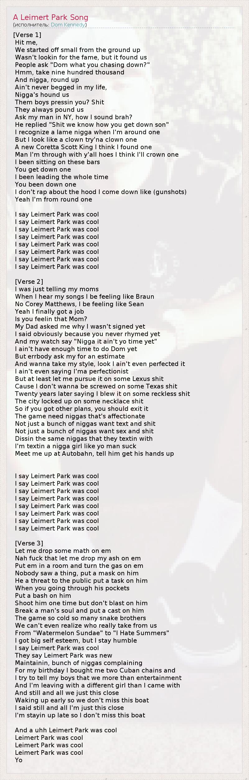 [Verse 1] Hit me, We started off small from the ground up Wasn't lookin for the fame, but it found us People ask "Dom what you chasing down?" Hmm, take nine hundred thousand And nigga, round up Ain't never begged in my life, Nigga's hound us Them boys pressin you? Shit They always pound us Ask my man in NY, how I sound brah? He replied "Shit we know how you get down son" I recognize a lame nigga when I'm around one But I look like a clown try'na clown one A new Coretta Scott King I think I found one Man I'm through with y'all hoes I think I'll crown one I been sitting on these bars You get down one I been leading the whole time You been down one I don't rap about the hood I come down like (gunshots) Yeah I'm from round one I say Leimert Park was cool I say Leimert Park was cool I say Leimert Park was cool I say Leimert Park was cool I say Leimert Park was cool I say Leimert Park was cool I say Leimert Park was cool I say Leimert Park was cool [Verse 2] I was just telling my moms When I hear my songs I be feeling like Braun No Corey Matthews, I be feeling like Sean Yeah I finally got a job Is you feelin that Mom? My Dad asked me why I wasn't signed yet I said obviously because you never rhymed yet And my watch say "Nigga it ain't yo time yet" I ain't have enough time to do Dom yet But errbody ask my for an estimate And wanna take my style, look I ain't even perfected it I ain't even saying I'ma perfectionist But at least let me pursue it on some Lexus shit Cause I don't wanna be screwed on some Texas shit Twenty years later saying I blew it on some reckless shit The city locked up on some necklace shit So if you got other plans, you should exit it The game need niggas that's affectionate Not just a bunch of niggas want text and shit Not just a bunch of niggas want sex and shit Dissin the same niggas that they textin with I'm textin a nigga girl like yo man suck Meet me up at Autobahn, tell him get his hands up I say Leimert Park was cool I say Leimert Park was cool I say Leimert Park was cool I say Leimert Park was cool I say Leimert Park was cool I say Leimert Park was cool I say Leimert Park was cool I say Leimert Park was cool [Verse 3] Let me drop some math on em Nah fuck that let me drop my ash on em Put em in a room and turn the gas on em Nobody saw a thing, put a mask on him He a threat to the public put a task on him When you going through his pockets Put a bash on him Shoot him one time but don't blast on him Break a man's soul and put a cast on him The game so cold so many snake brothers We can't even realize who really take from us From "Watermelon Sundae" to "I Hate Summers" I got big self esteem, but I stay humble I say Leimert Park was cool They say Leimert Park was new Maintainin, bunch of niggas complaining For my birthday I bought me two Cuban chains and I try to tell my boys that we more than entertainment And I'm leaving with a different girl than I came with And still and all we just this close Waking up early so we don't miss this boat I said still and all I'm just this close I'm stayin up late so I don't miss this boat And a uhh Leimert Park was cool Leimert Park was cool Leimert Park was cool Leimert Park was cool Yo